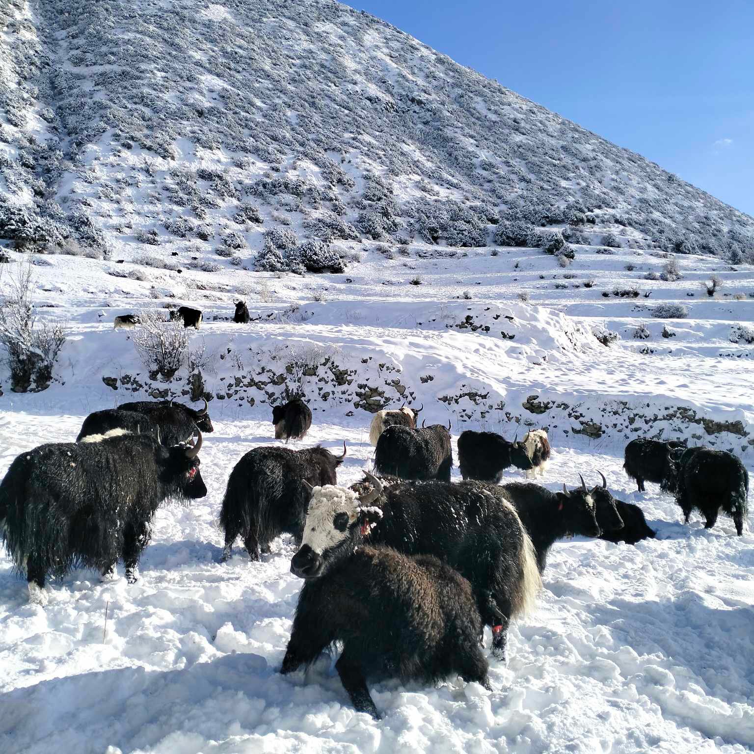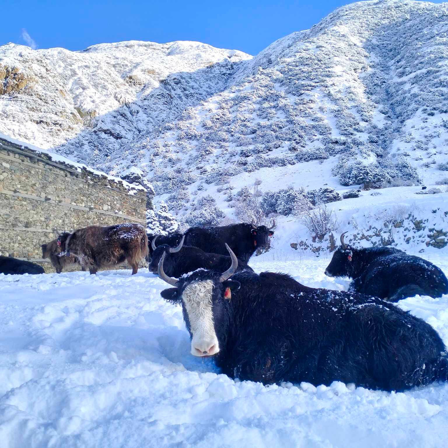 मनाङको ङिस्याङ गाउँपालिका–५ भ्राकामा भएको हिमपात । हिउँमा बसेका चौंरी । तस्बिर : नवीन लामिछाने/रासस