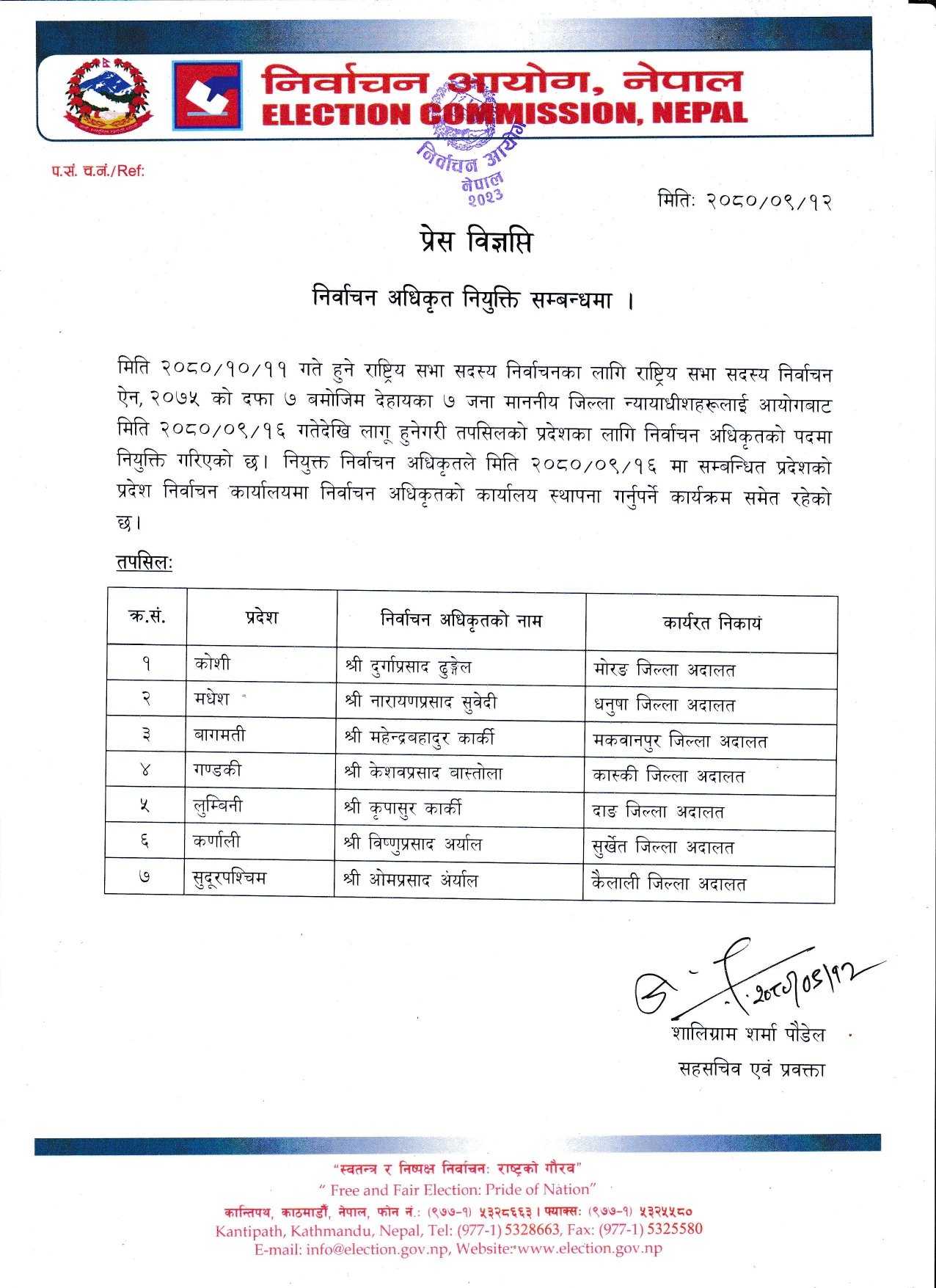 कोशी प्रदेशका लागि मोरङ जिल्ला अदालतका न्यायाधीश दुर्गाप्रसाद ढुंगेल, मधेश प्रदेशका लागि धनुषा जिल्ला अदालतका न्यायाधीश नारायणप्रसाद सुवेदी, बागमती प्रदेशका लागि मकवानपुर जिल्ला अदालतका न्यायाधीश महेन्द्रबहादुर कार्की र गण्डकी प्रदेशका लागि कास्की जिल्ला अदालतका न्यायाधीश केशवप्रसाद बास्तोला निर्वाचन अधिकृत नियुक्त भएका छन् ।त्यस्तै लुम्बिनी प्रदेशका लागि दाङ जिल्ला अदालतका न्यायाधीश कृपासुर कार्की, कर्णाली प्रदेशका लागि सुर्खेत जिल्ला अदालतका न्यायाधीश विष्णुप्रसाद अर्याल र सुदूरपश्चिमका लागि कैलाली जिल्ला अदालतका न्यायाधीश ओमप्रसाद अर्याल नियुक्त भएका छन्।