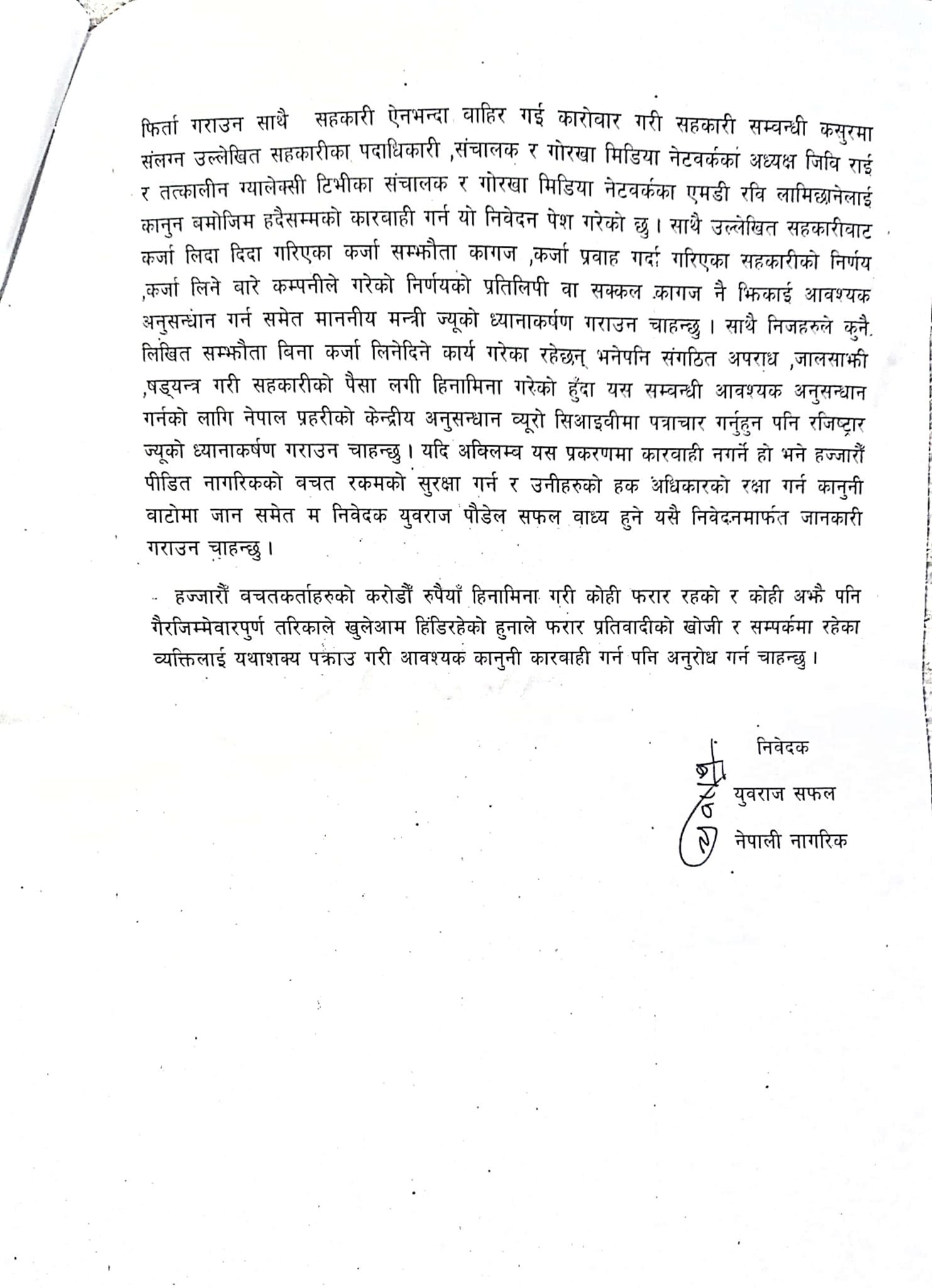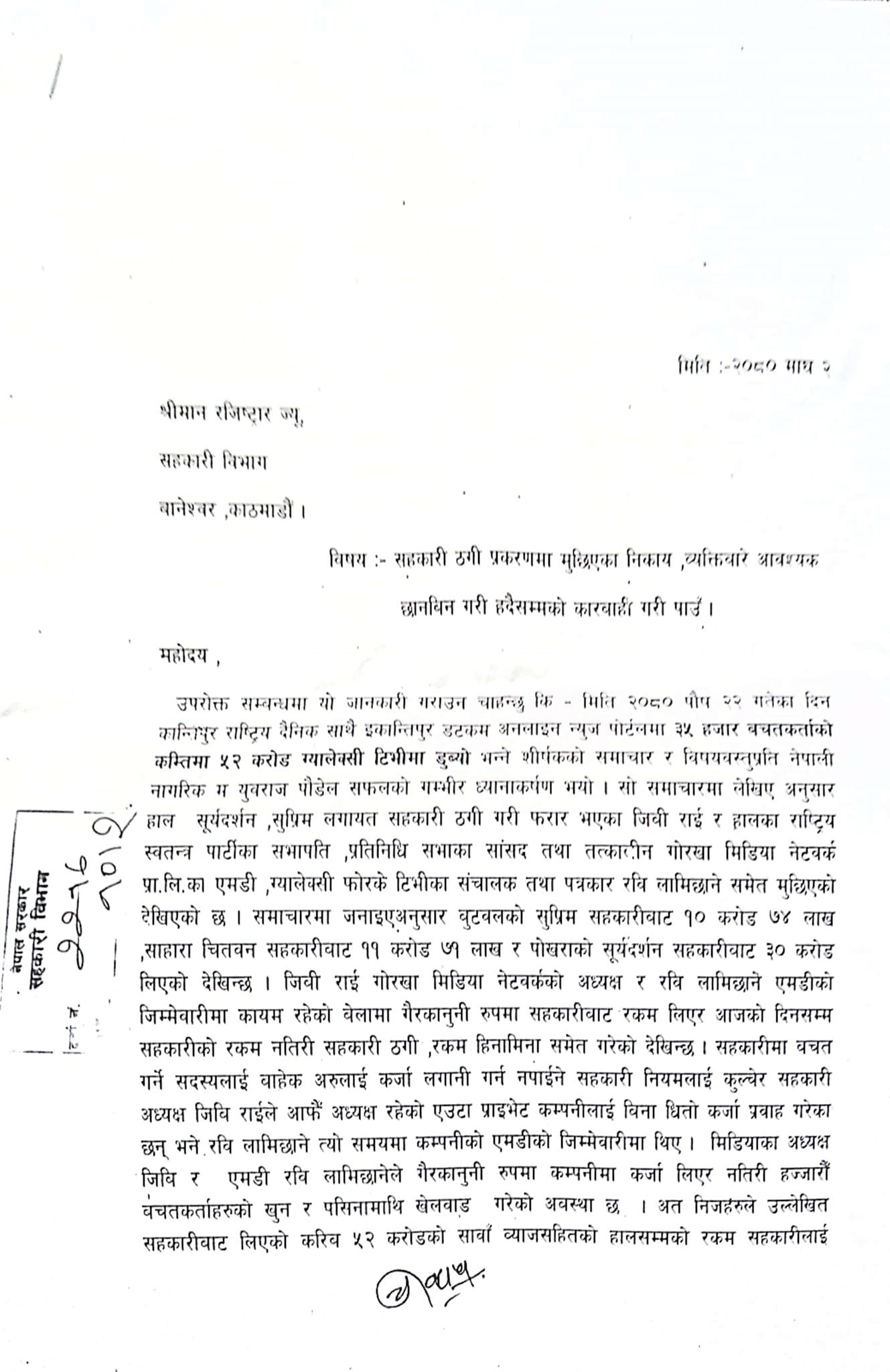 निदवेदनमा उनले भनेका छन्,‘सहकारी ऐनभन्दा बाहिर गई कारोबार गरी सहकारी सम्बन्धी कसुरमा संलग्न उल्लेखित सहकारीका पदाधिकारी, सञ्चालक र गोरखा मिडिया नेटवर्कका अध्यक्ष जीबी राई र तत्कालीन ग्यालेक्सी टिभीका सञ्चालक र गोरखा मिडिया नेटवर्कका एमडी रवि लामिछानेलाई कानुन बमोजिम हदैसम्मको कारबाही गर्न यो निवेदन पेस गरेको छु ।’