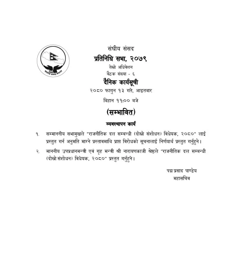 बैठकमा गृहमन्त्री नारायणकाजी श्रेष्ठले राजनीतिक दलसम्बन्धी (दोस्रो संशोधन) विधेयक, २०८० प्रस्तुत गर्नेछन् ।