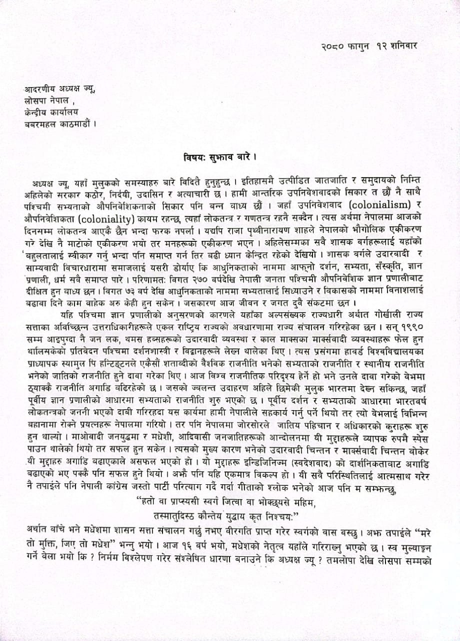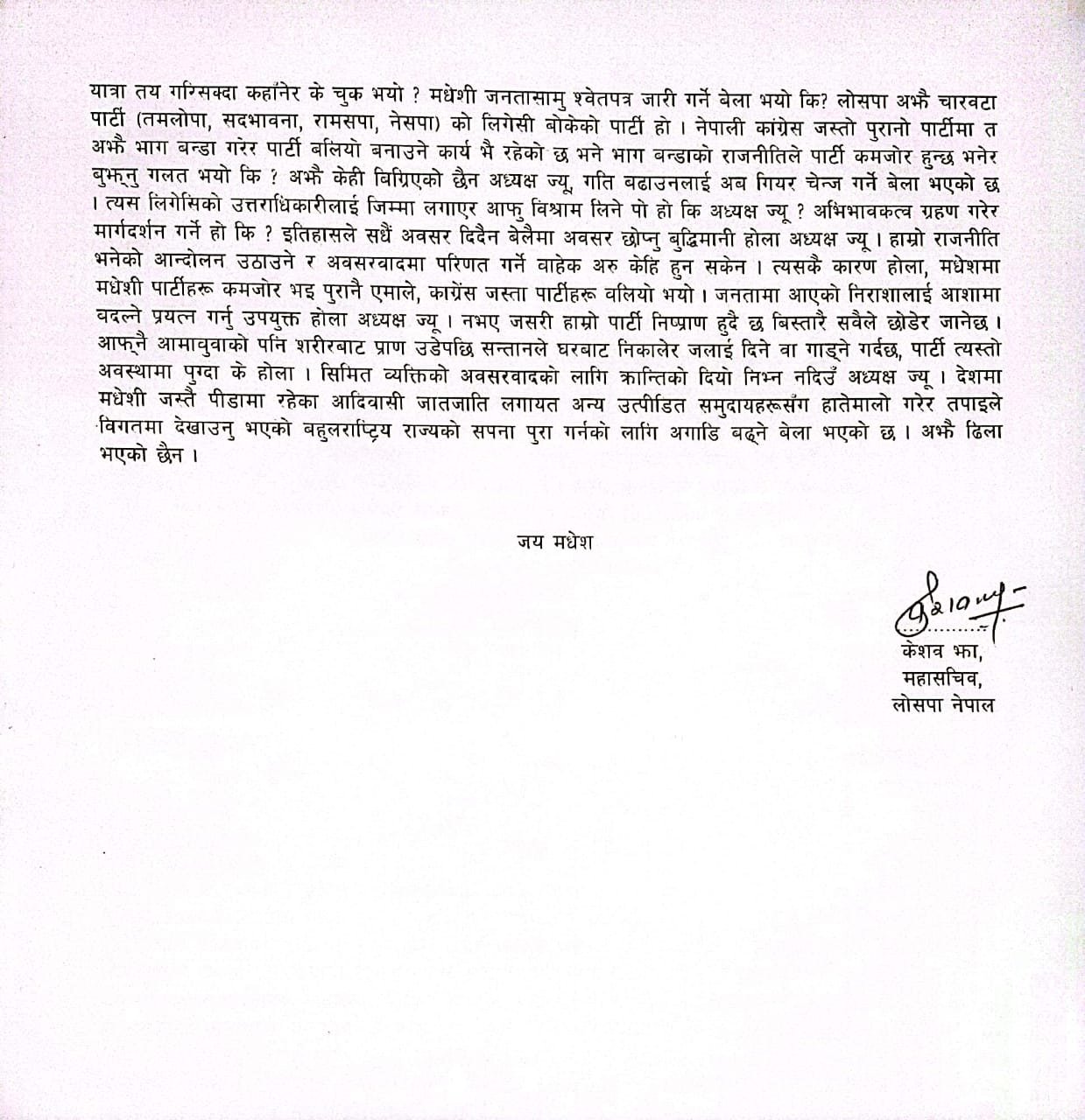 उनले पत्रमा भनेका छन्, ‘आज १६ वर्ष भयो, मधेशको नेतृत्व यहाँले गरिराख्नु भएको छ। स्वमुल्याङ्कन गर्ने बेला भयो कि? निर्मम विश्लेषण गरेर संश्लेषित धारणा बनाउने कि अध्यक्ष ज्यू? तमलोपा देखि लोसपा सम्मको यात्रा तय गरिसक्दा कहाँनेर के चुक भयो? मधेशी जनतासामु श्वेतपत्र जारी गर्ने बेला भयो कि?’झाले ठाकुरलाई गति बढाउनलाई गियर चेन्ज गर्ने बेला भएको सुझाव पनि दिएका छन् ।