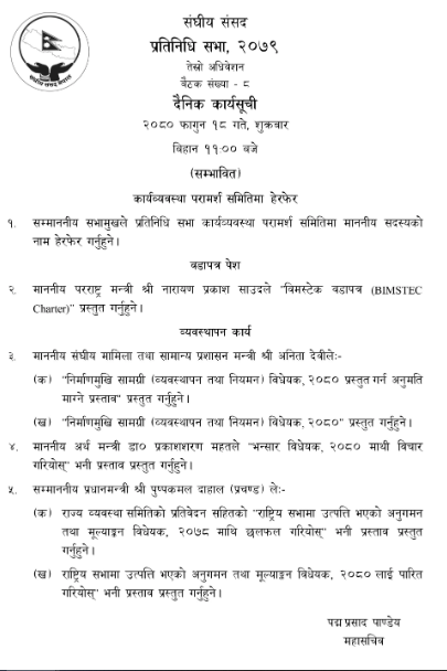बैठकमा परराष्ट्र नारायण प्रकाश साउदले विमस्टेक बडापत्र प्रस्तुत गर्ने, सङ्घीय मामिला तथा सामान्य प्रशासन मन्त्री निता देवीले निर्माणमुखी सामग्री (व्यवस्थापन तथा नियमन) विधेयक, २०८० प्रस्तुत गर्न अनुमति माग्ने प्रस्ताव प्रस्तुत गर्ने कार्यसूची रहेको छ ।