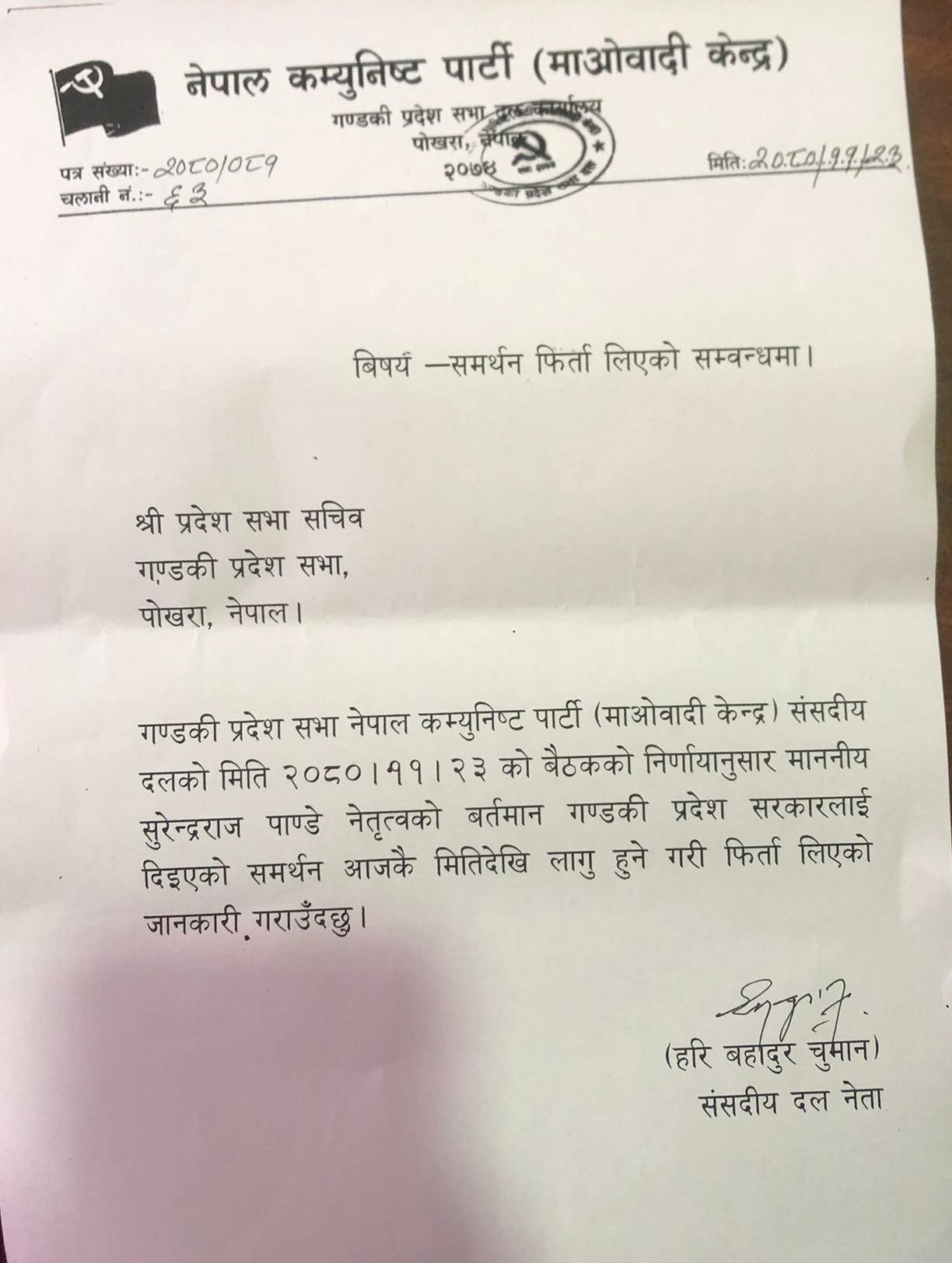 पोखरा । गण्डकी प्रदेशमा नेकपा माओवादी केन्द्रले सरकारलाई दिएको समर्थन फिर्ता लिएको छ । गण्डकीमा माओवादी केन्द्रले मुख्यमन्त्री सुरेन्द्रराज पाण्डेलाई दिएको समर्थन बुधबार फिर्ता लिएको हो ।
