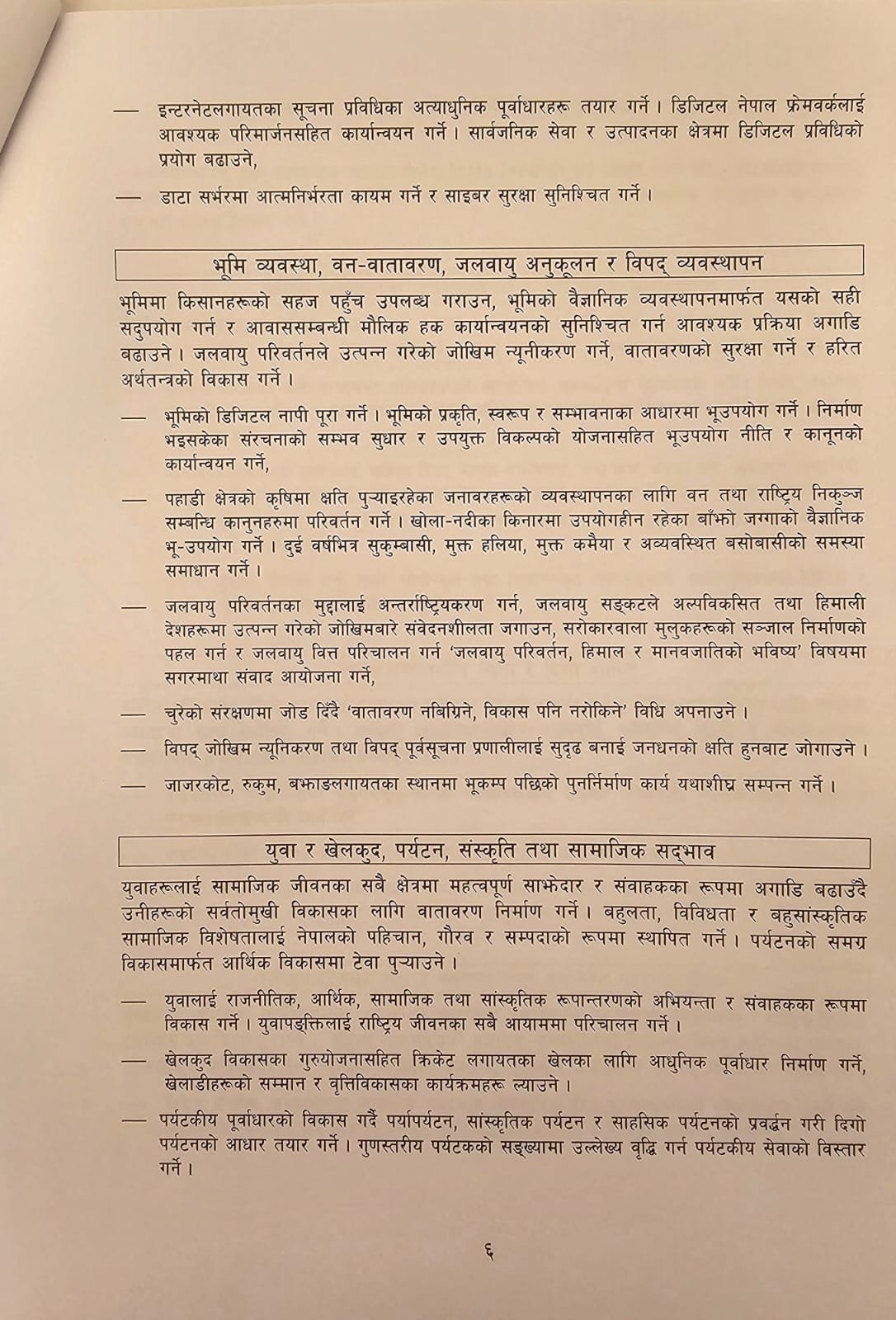 जनतामा रहेको निराशा चिर्दै आशा र भरोसा कायम गर्ने लक्ष्य राखिएको सङ्कल्पमा नेपाली जनताको सर्वोपरि हितलाई केन्द्रमा राखिएको छ । सत्तारूढ गठबन्धनमा नेपाल कम्युनिष्ट पार्टी (एमाले), नेपाल कम्युनिष्ट पार्टी (माओवादी केन्द्र), राष्ट्रिय स्वतन्त्र पार्टी, जनता समाजवादी पार्टी, नेपाल कम्युनिष्ट पार्टी (एकीकृत समाजवादी)  समावेश छन् ।शेयर बजारलाई नीतिगत सुधारमार्फत चलायमान बनाउने, हरित वित्तको परिचालन, १५औँ आवधिक योजनाको वस्तुनिष्ट मूल्याङ्कन गरी १६औँ आवधिक योजना कार्यान्वयनमा ल्याउने, वित्तीय संस्थालाई विसङ्गति मुक्त बनाउने, सहकारी, लघुवित्तका समस्या समाधान गर्ने लक्ष्य सङ्कल्पमा राखिएको छ ।