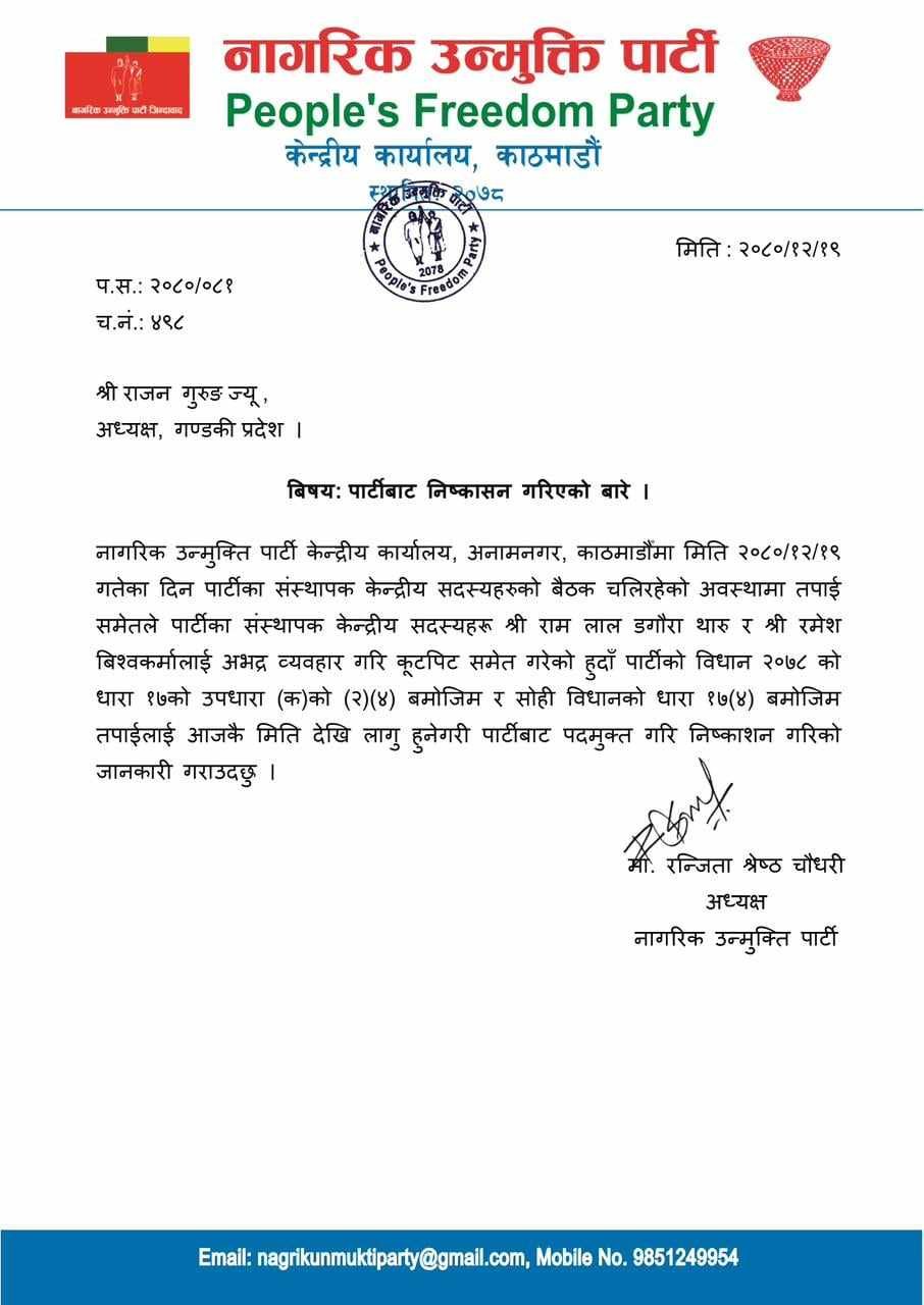 सुदूरपश्चिम । नागरिक उन्मुक्ति पार्टीकी अध्यक्ष रञ्जिता चौधरीले दुई प्रदेश अध्यक्षमाथि कारबाही गरेकी छन् । अध्यक्ष चौधरीले गण्डकी अध्यक्ष राजन गुरुङ र वाग्मती अध्यक्ष दीपबहादुर योञ्जन तामाङलाई पार्टीबाट निष्कासन गरेकी हुन् ।