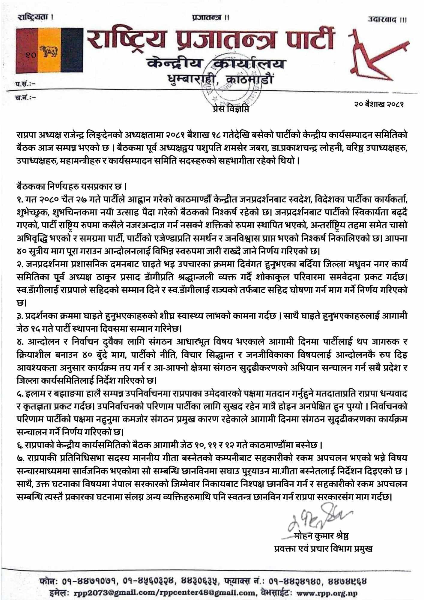 बिहीबार राप्रपाको केन्द्रीय कार्यसम्पादन समितिको बैठकपछि पार्टी प्रवक्ता मोहनकुमार श्रेष्ठले जारी गरेको विज्ञप्तिमा आफ्ना सांसद बस्नेतका साथै सहकारी ठगी प्रकरणमा संलग्न अन्य व्यक्तिबारे पनि छानबिन गर्न सरकारसँग माग गरिएको छ ।