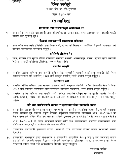 त्यसपछि सांसदहरूबाट प्राप्त संशोधनहरू प्रस्तुत गरिनेछ । नीति तथा कार्यक्रममा सांसदहरूले उठाएका प्रश्नको प्रधानमन्त्री जवाफ पनि दिनेछन् । यस्तै प्रधानमन्त्री तथा मन्त्रिपरिषद्को कार्यालयको पत्रको ब्यहोरा पढेर सुनाउने, बैठकको अध्यक्षता गर्ने सदस्यहरूको मनोनयन गर्ने, शिक्षा, स्वास्थ्य तथा सूचना प्रविधि समितिका सभापति अम्मरबहादुर थापाले सुरक्षण मुद्रण सम्बन्धी विधेयक सम्बन्धी समितिको प्रतिवेदन, २०८० पेस गरिनेछ ।