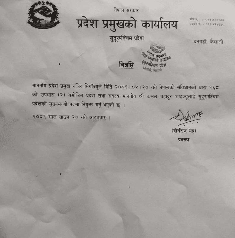 सुदूरपश्चिम प्रदेशको मुख्यमन्त्रीमा शाह नियुक्त