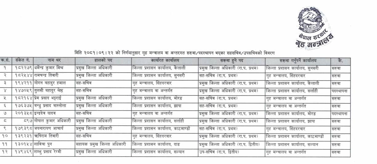 यस्तै कैलाली, सुनसरी, मोरङ, झापा, सर्लाही र सल्यानका प्रमुख जिल्ला अधिकारी पनि हेरफेर भएका छन्।
