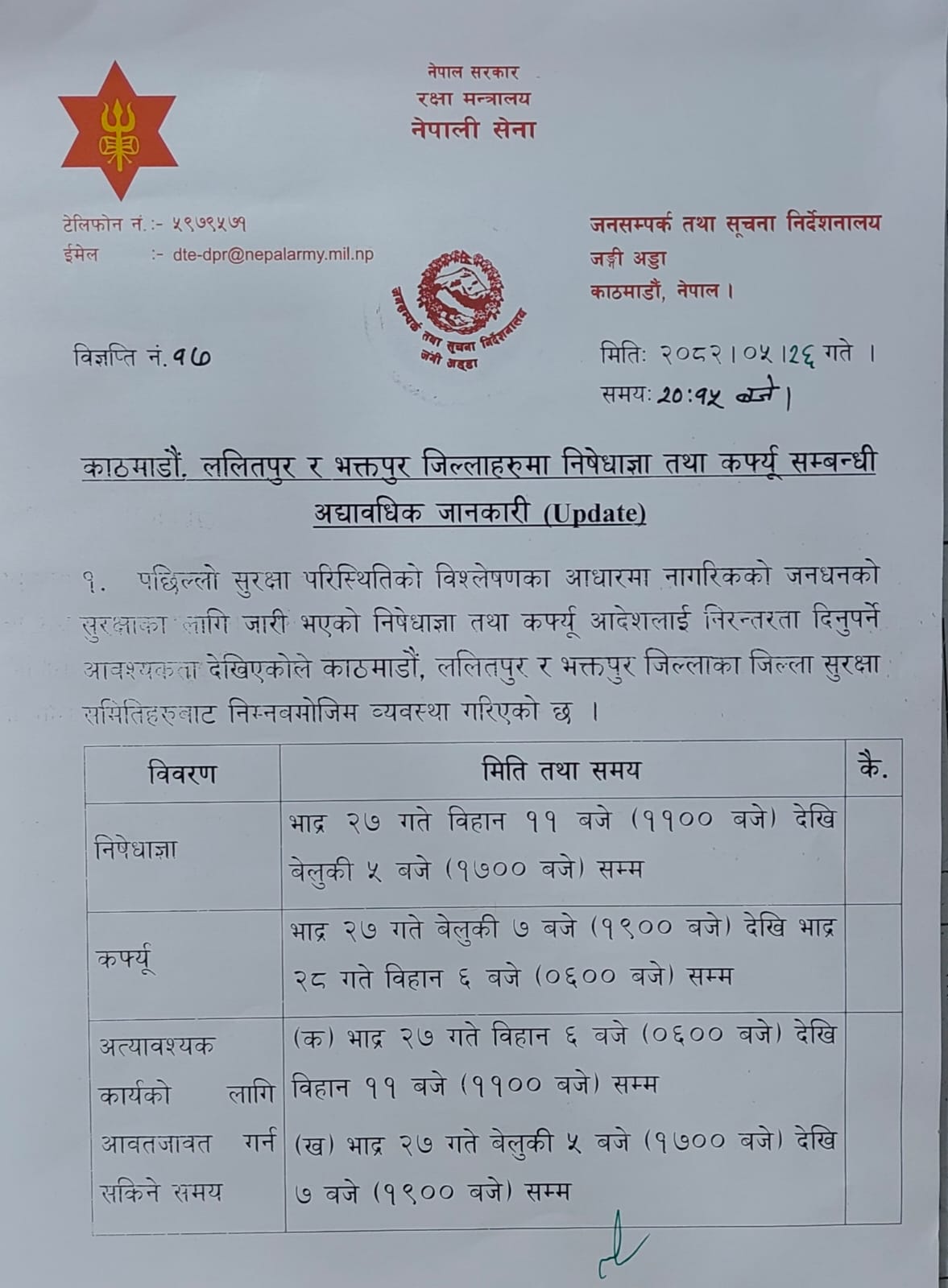 सेनाले भदौ २७ गते बिहान ११ बजेदेखि साँझ ५ बजेम्म निषेधाज्ञा तथा बेलुकी ७ बजेदेखि २८ गते बिहान ६ बजेसम्म भने कर्फ्यू आदेश जारी रहने जनाएको छ । निषेधाज्ञा तथा कफ्र्युको समयमा पनि अत्यावश्यक सेवाका जस्तैः एम्बुलेन्स, शव वाहन, दमकल, स्वास्थ्यकर्मी, सुरक्षाकर्मी र सञ्चारकर्मीका साथै खाद्यान्न, ग्यास, इन्धन, दुध, तरकारी, पानी, सञ्चार प्रदायक कम्पनी र औषधि ओसारपसार गर्ने सवारी साधन सञ्चालन गर्न सकिने छ ।