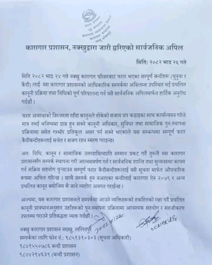 उक्त सूचना जारी गरेर नख्खु कारागार प्रशासनले फरार भएका सबै कैदी र थुनुवालाई अविलम्ब आत्मसमर्पण गर्न औपचारिक अपिल गरेको छ।