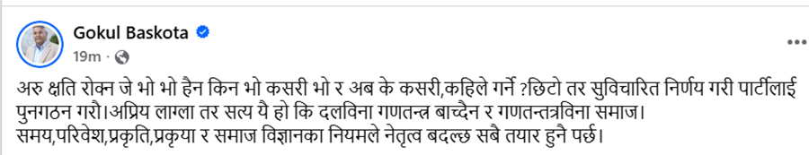 उनले फेसबुकमा लेखेका छन्, ‘छिटो तर सुविचारित निर्णय गरी पार्टीलाई पुनर्गठन गरौं ।’ राजनीतिक दल विना गणतन्त्र र गणतन्त्र विना समाज बाँच्दैन भन्दै बास्कोटाले लेखेका छन्, ‘समय, परिवेश, प्रकृति, प्रकृया र समाज विज्ञानका नियमले नेतृत्व बदल्छ सबै तयार हुनैपर्छ ।’