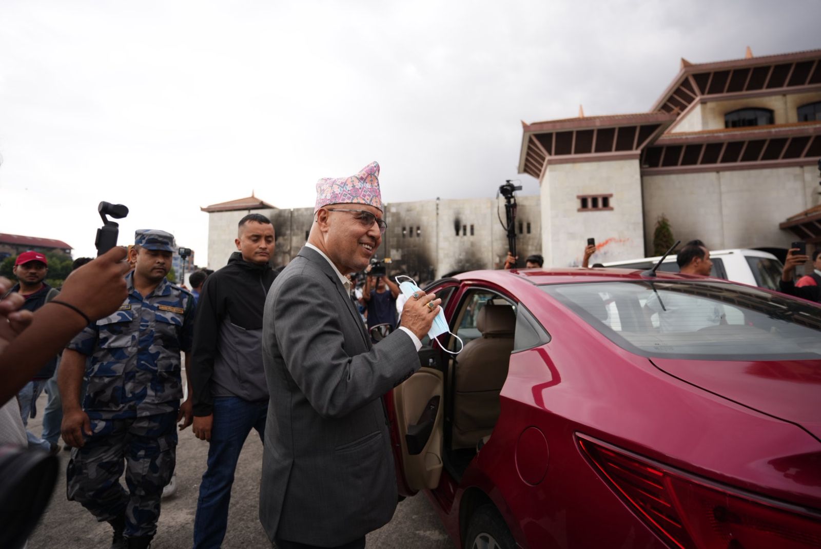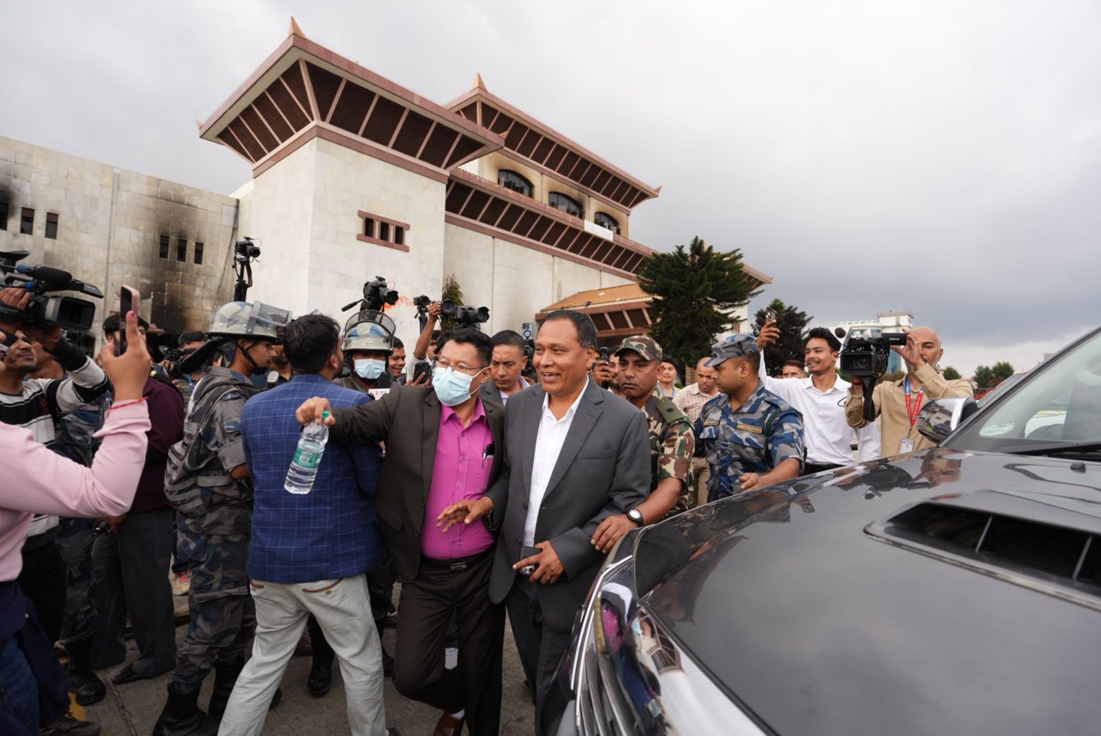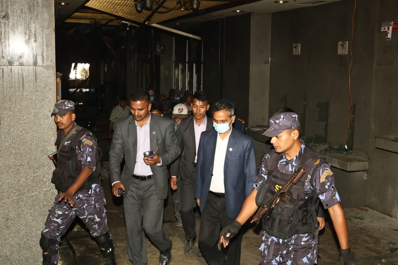 आगजनीबाट संसद् भवन ध्वस्त भएको थियो । उक्त क्षतिग्रस्त भवनको अवलोकनमा मन्त्रीत्रय खनाल, घिसिङ र अर्याल पुगेका हुन् । खनाल अर्थमन्त्री हुन् भने अर्याल गृह र कानुन, न्याय तथा संसदीय मामिला मन्त्री हुन् । घिसिङ सहरी विकास, ऊर्जा, जलस्रोत तथा सिँचाइ र भौतिक पूर्वाधार तथा यातायात मन्त्री रहेका छन् ।