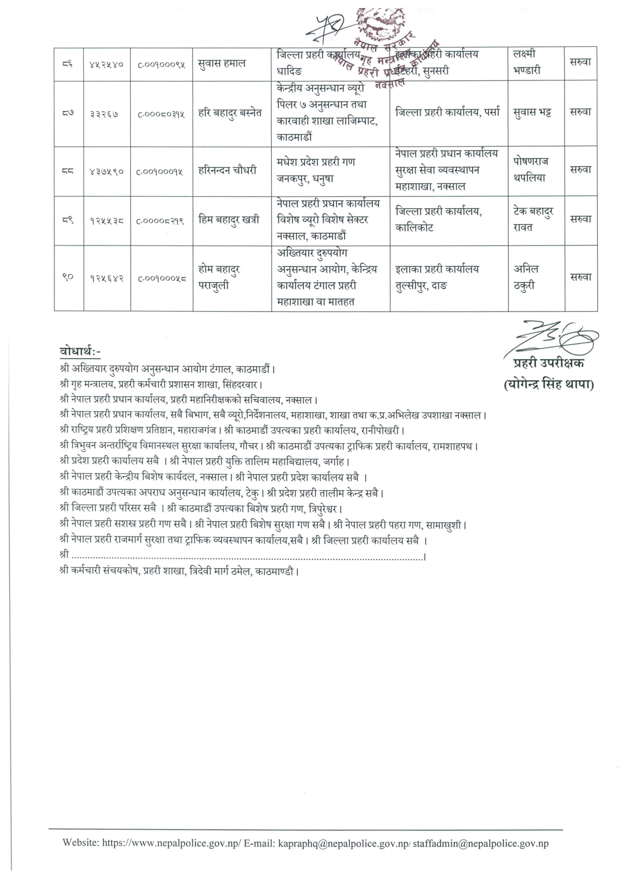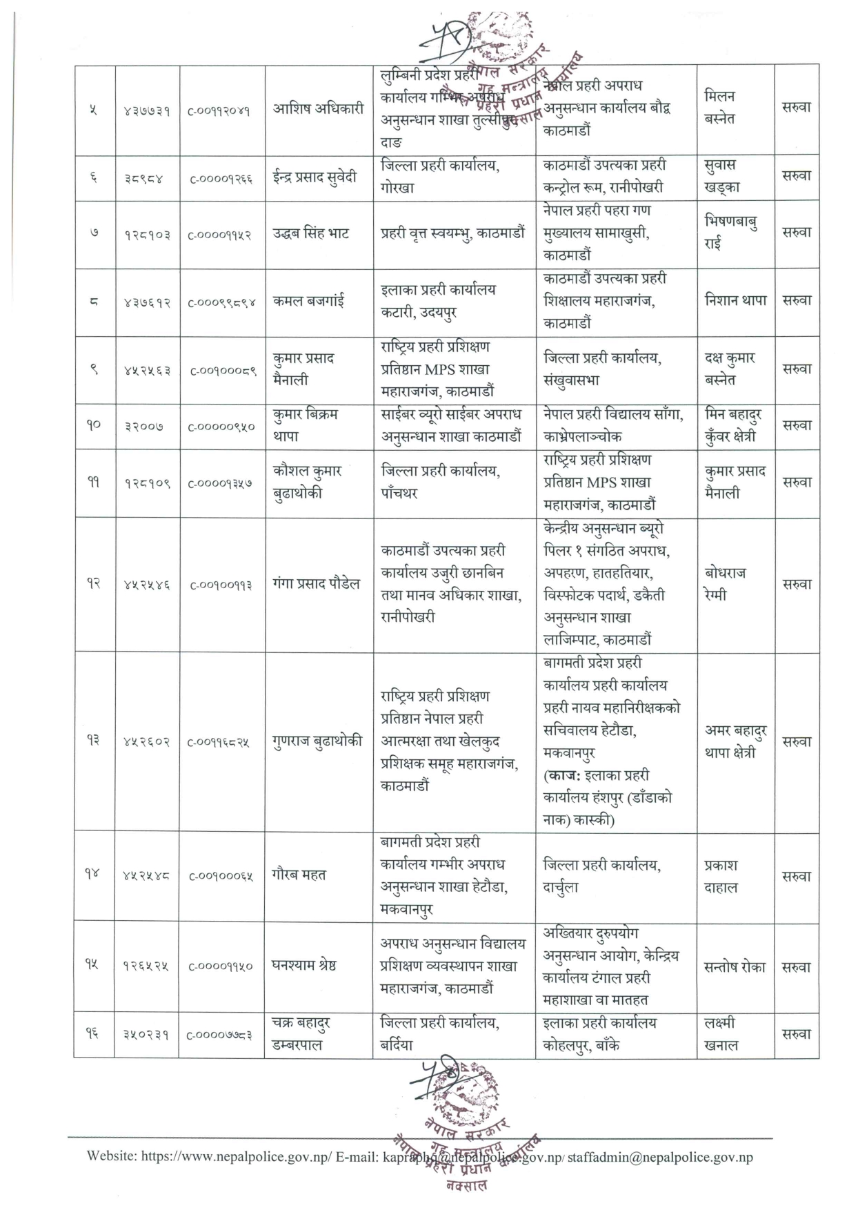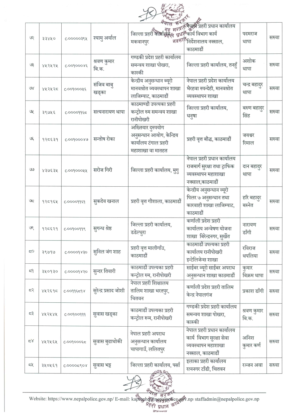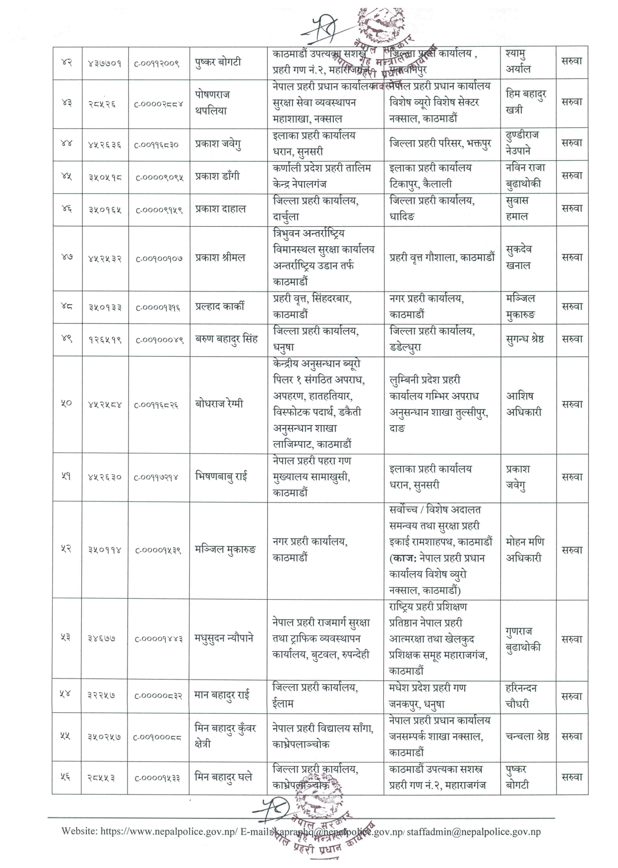 सरुवा हुनेहरूमा काठमाडौँ उपत्यकाका बृत्तसहित विभिन्न कार्यालय र जिल्लाहरू छन् । केही जिल्लामा, इलाकामा र वृत्तमा इन्चार्ज हेरफेर भएका छन् ।