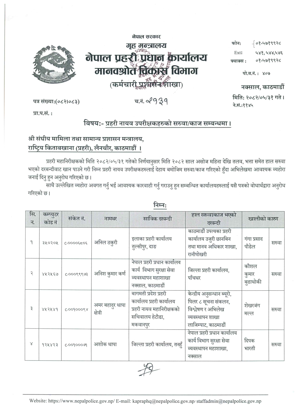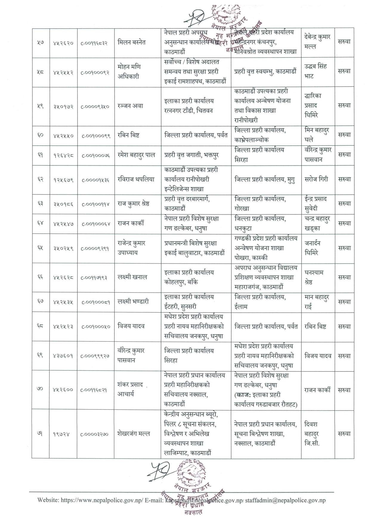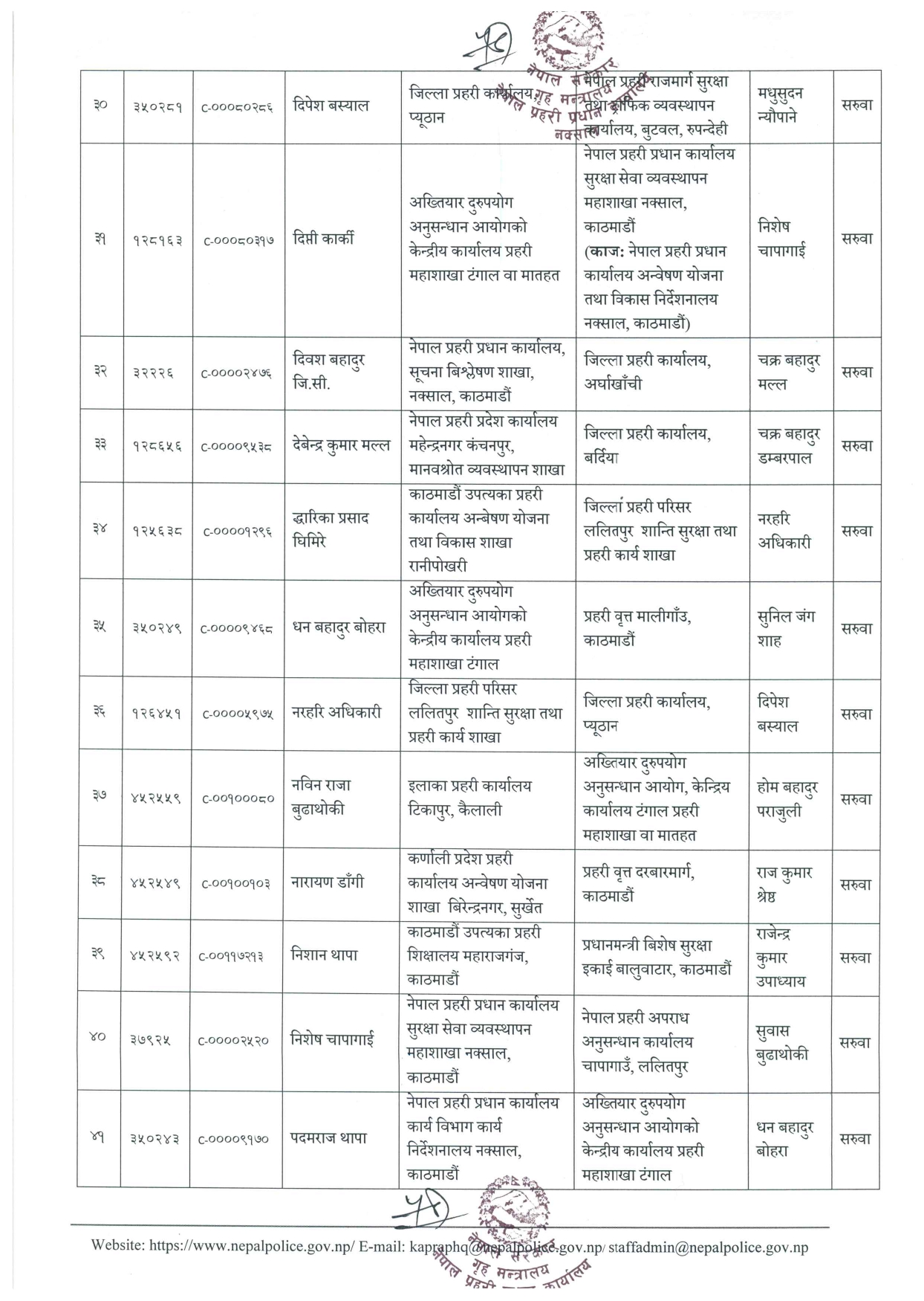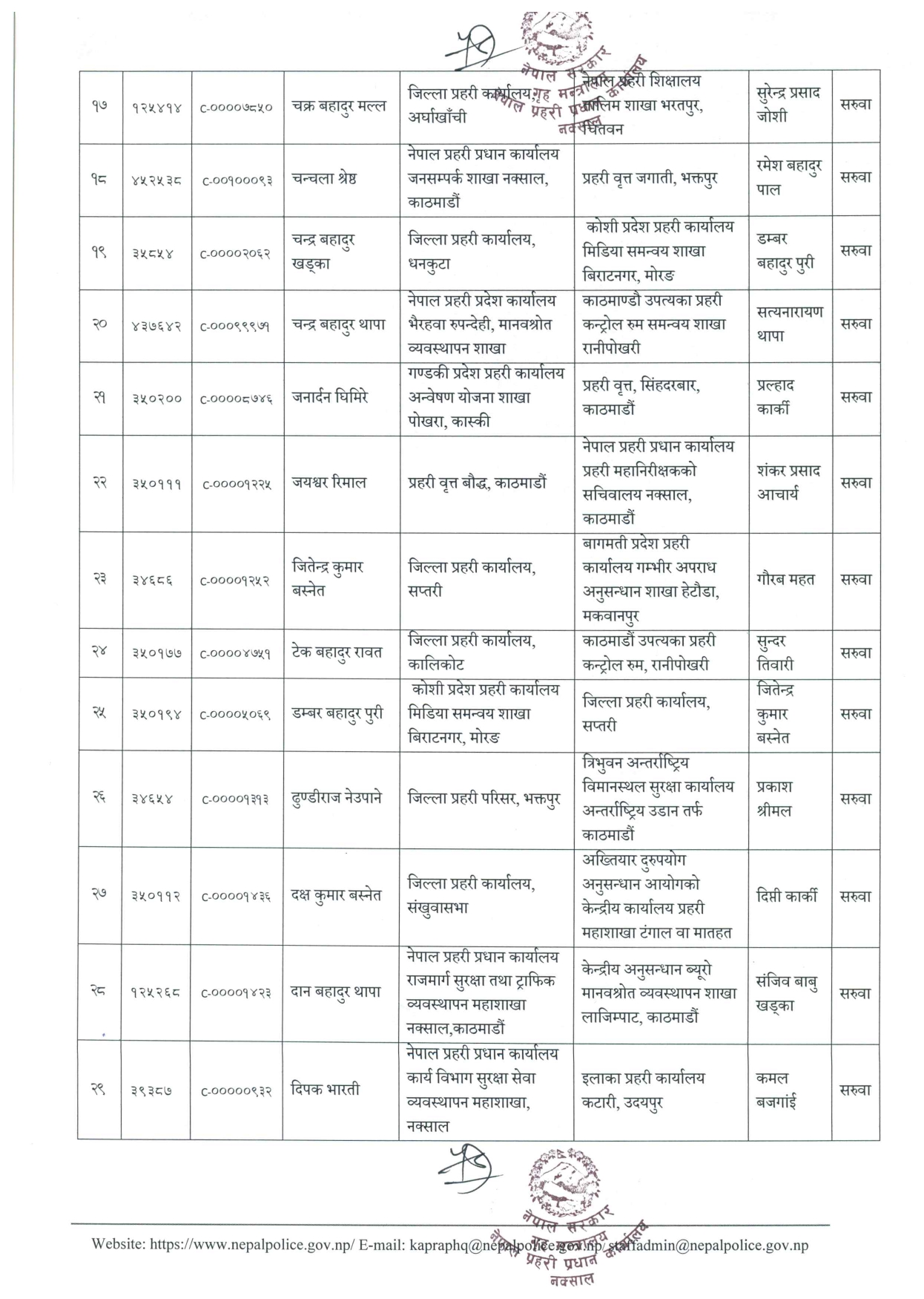 सरुवा हुनेहरूमा काठमाडौँ उपत्यकाका बृत्तसहित विभिन्न कार्यालय र जिल्लाहरू छन् । केही जिल्लामा, इलाकामा र वृत्तमा इन्चार्ज हेरफेर भएका छन् ।