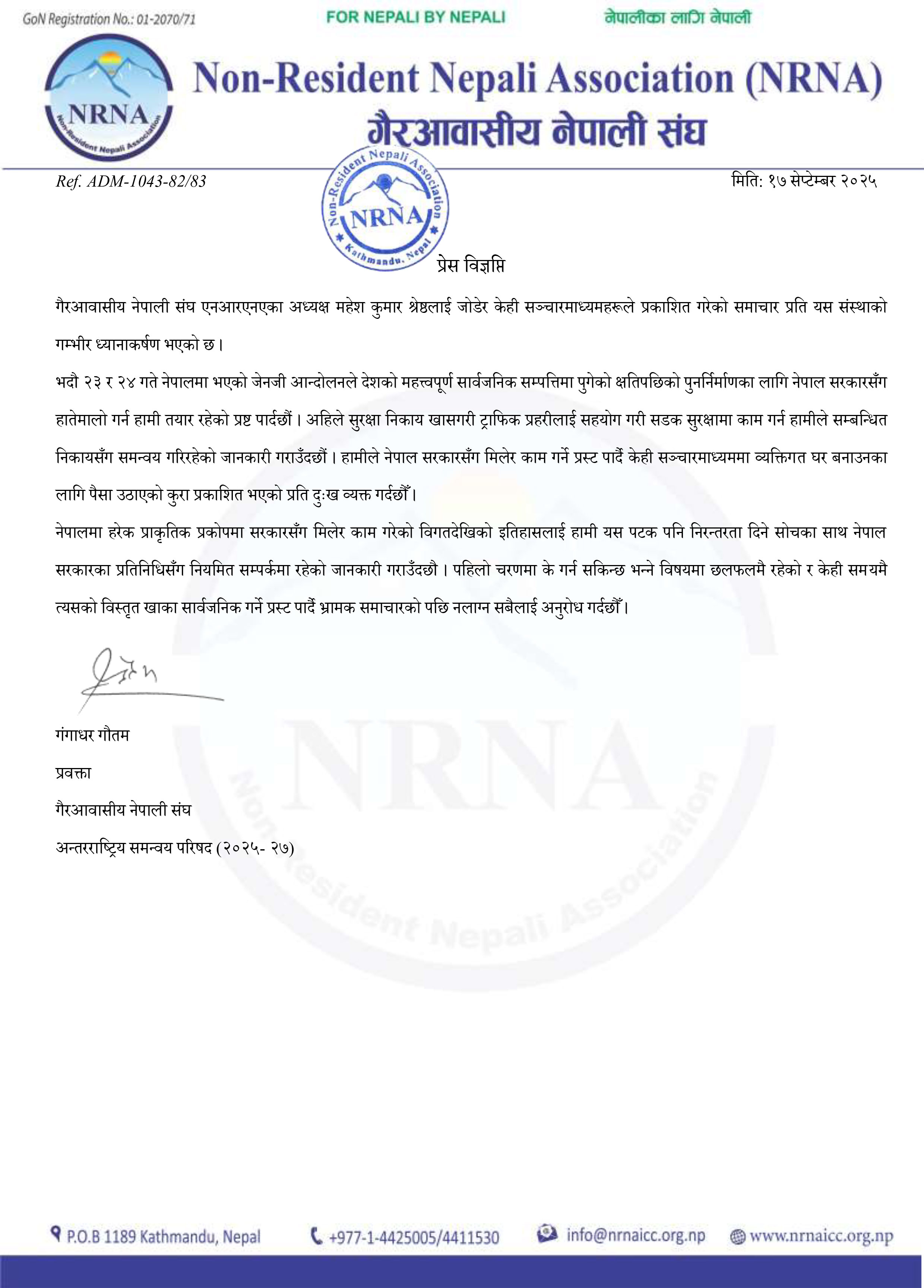 काठमाडौँ । गैरआवासीय नेपाली संघ (एनआरएनए) ले आफ्नो अध्यक्ष महेशकुमार श्रेष्ठलाई जोडेर केही सञ्चारमाध्यमले प्रकाशित गरेको समाचारप्रति गम्भीर ध्यानाकर्षण भएको जनाएको छ। नेपाल सरकारसँग सहकार्य गर्दै सार्वजनिक सम्पत्तिको पुनर्निर्माणमा जुट्न लागेको बेला भ्रम फैलाउने प्रयास हुनु दुःखद रहेको संघले बताएको हो।