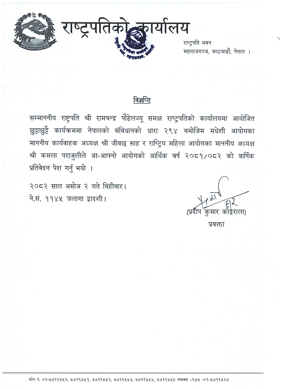 काठामाडौँ । राष्ट्रपति रामचन्द्र पौडेलसमक्ष मधेसी आयोग र राष्ट्रिय महिला आयोगले आर्थिक वर्ष २०८१/०८२ को वार्षिक प्रतिवेदन पेश गरेका छन् ।