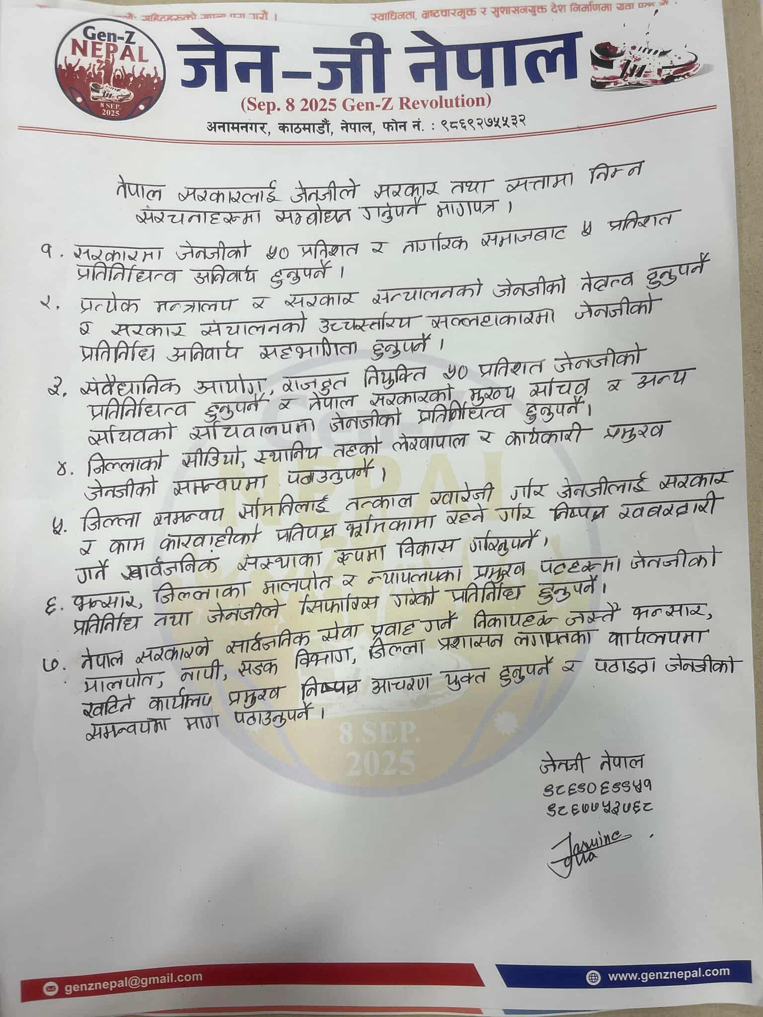 ज्ञापन पत्रमा सरकारमा जेनजीको ५० प्रतिशत र नागरिक समाजबाट पाँच प्रतिशत प्रतिनिधित्व हुनुपर्ने, मन्त्रालय र सरकार सञ्चालनमा जेनजीको नेतृत्व हुनुपर्ने, संवैधानिक आयोग, राजदूत नियुक्ति ५० प्रतिशत जेनजीको प्रतिनिधित्व हुनुपर्ने र नेपाल सरकारको मुख्य सचिव र अन्य सचिवको सचिवालयमा जेनजीको प्रतिनिधित्व हुनुपर्ने लगायत माग राखिएको छ।