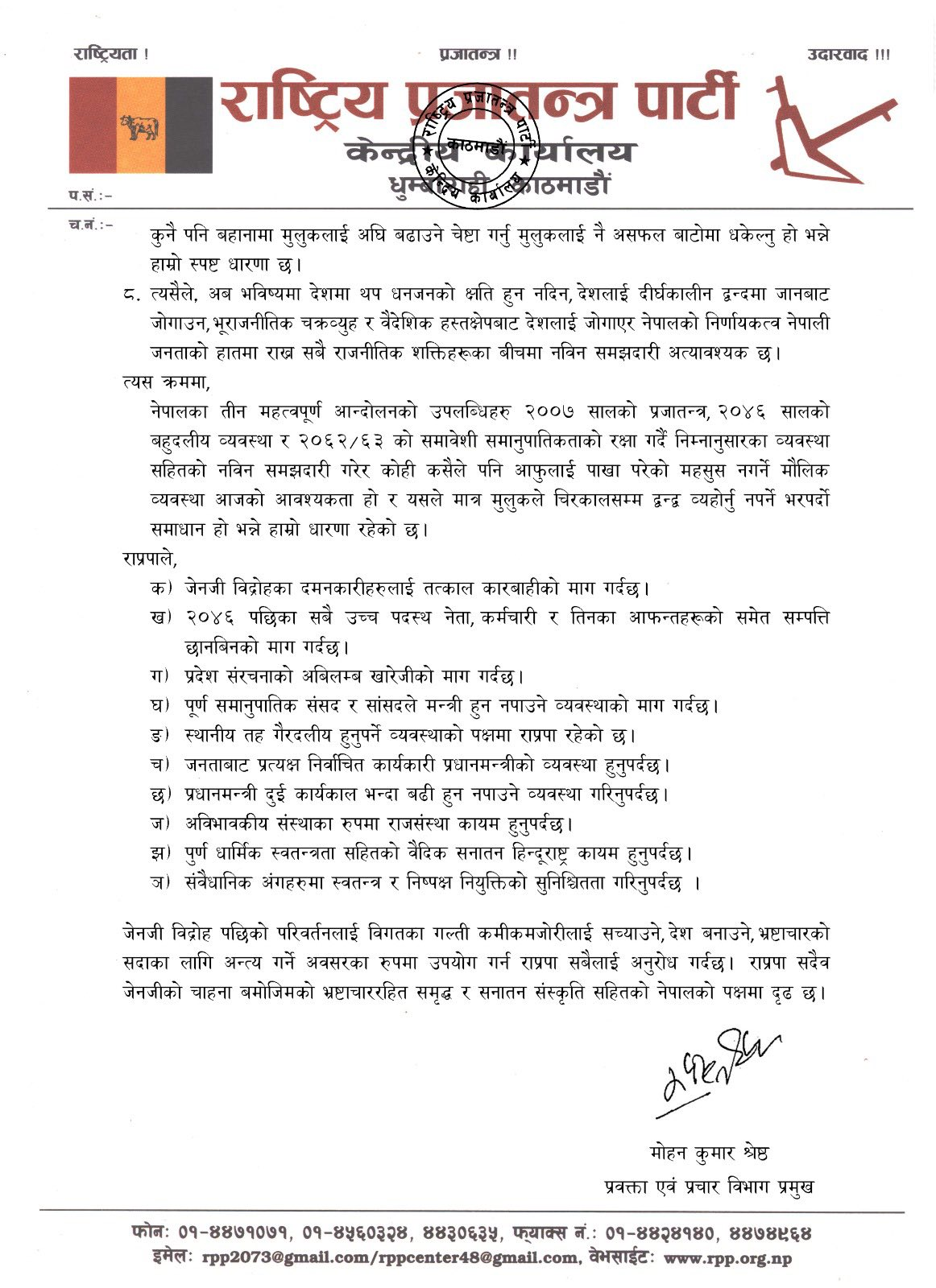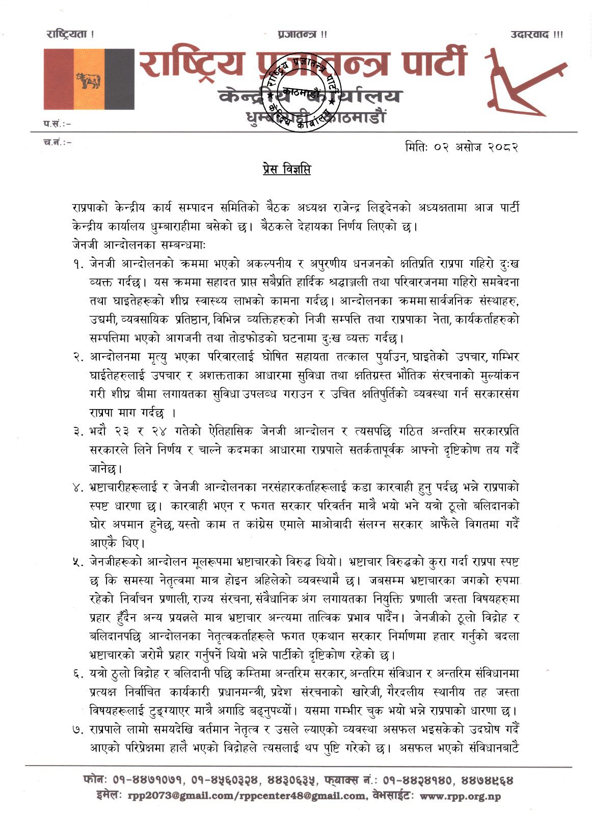 बैठकपछि प्रवक्ता मोहनकुमार श्रेष्ठले वक्तव्य जारी गर्दै भ्रष्टाचारविरुद्धको जेनजी विद्रोहलाई निर्वाचन प्रणाली, राज्य संरचना, संवैधानिक अंगलगायत नियुक्ति प्रणालीमा प्रहार गरेर मात्र टुंग्याउनुपर्ने प्रष्ट पारेका छन् । राप्रपाले निष्कर्षमा नपुर्याई जेनजी विद्रोहलाई टुंग्याउनु गम्भीर चूक बनेको छ ।