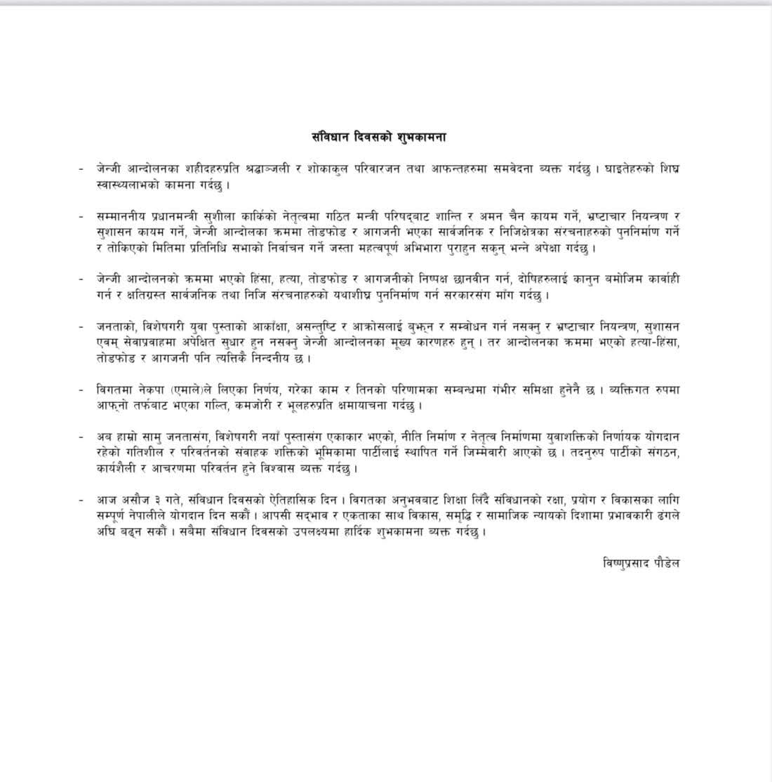 काठमाडौं । नेकपा (एमाले) का उपाध्यक्ष विष्णु पौडेलले संविधान दिवसको सन्दर्भमा शुभकामना दिँदै विगतमा पार्टीले लिएका निर्णय र गरेका कामको परिणामका सम्बन्धमा गम्भीर समीक्षा हुने बताएका छन् ।
