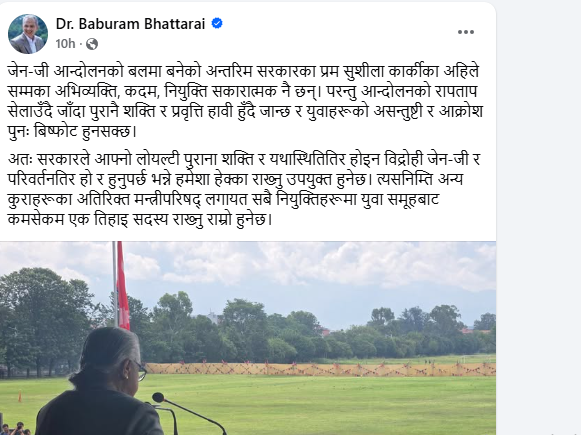 भट्टराईले भने, ‘जेन जी आन्दोलनको बलमा बनेको अन्तरिम सरकारका प्रम सुशीला कार्कीका अहिले सम्मका अभिव्यक्ति, कदम, नियुक्ति सकारात्मक नै छन्। परन्तु आन्दोलनको रापताप सेलाउँदै जाँदा पुरानै शक्ति र प्रवृत्ति हावी हुँदै जान्छ र युवाहरूको असन्तुष्टी र आक्रोश पुनः बिष्फोट हुनसक्छ। अतः सरकारले आफ्नो लोयल्टी पुराना शक्ति र यथास्थितितिर होइन विद्रोही जेन जी र परिवर्तनतिर हो र हुनुपर्छ भन्ने हमेशा हेक्का राख्नु उपयुक्त हुनेछ। त्यसनिम्ति अन्य कुराहरूका अतिरिक्त मन्त्रीपरिषद् लगायत सबै नियुक्तिहरूमा युवा समूहबाट कमसेकम एक तिहाइ सदस्य राख्नु राम्रो हुनेछ।’