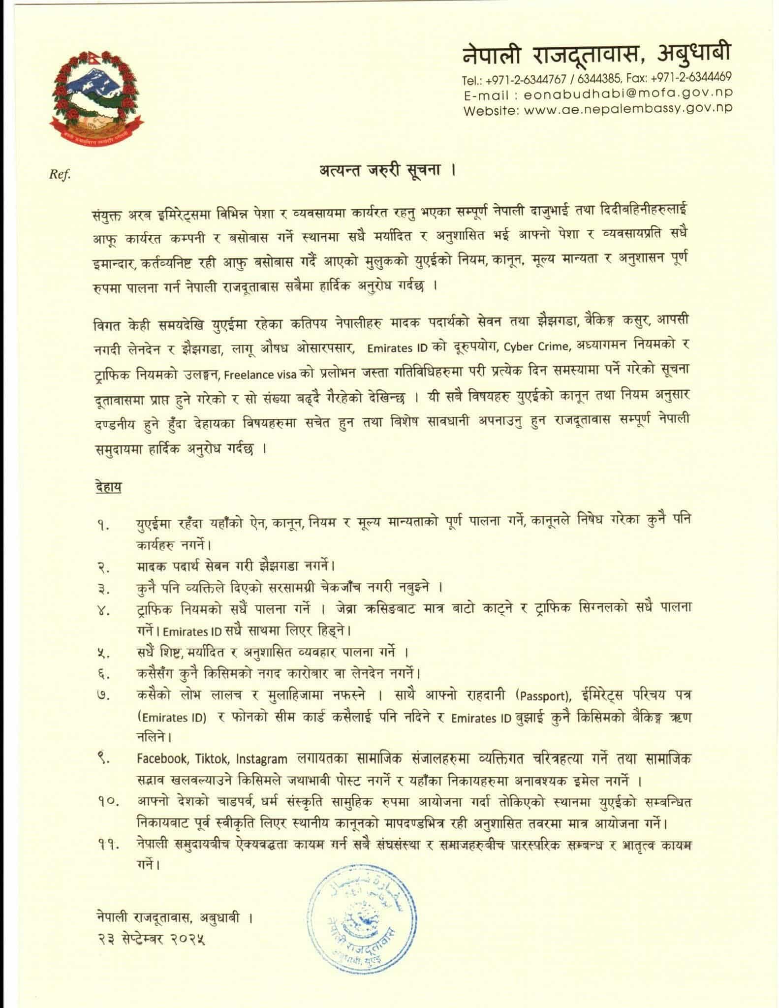 ‘बिगत केही समयदेखि युएईमा रहेका कतिपय नेपालीहरु मादक पदार्थको सेवन तथा झैझगडा,बैंकिङ्ग कसुर, आपसी नगदी लेनदेन र झैझगडा, लागुऔषध ओसारपसार, इमिरेट्स आईडीको दुरुपयोग, साइबर क्राइम, अध्यागमन नियमको र ट्राफिक नियमको उलङ्घन, फ्रिल्यान्स भिसाको प्रलोभन जस्ता गतिविधिहरूमा परी प्रत्येक दिन समस्यामा पर्ने गरेको सूचना दूतावासमा प्राप्त हुने गरेको र सो संख्या बढ्दै गैरहेको देखिन्छ ।’