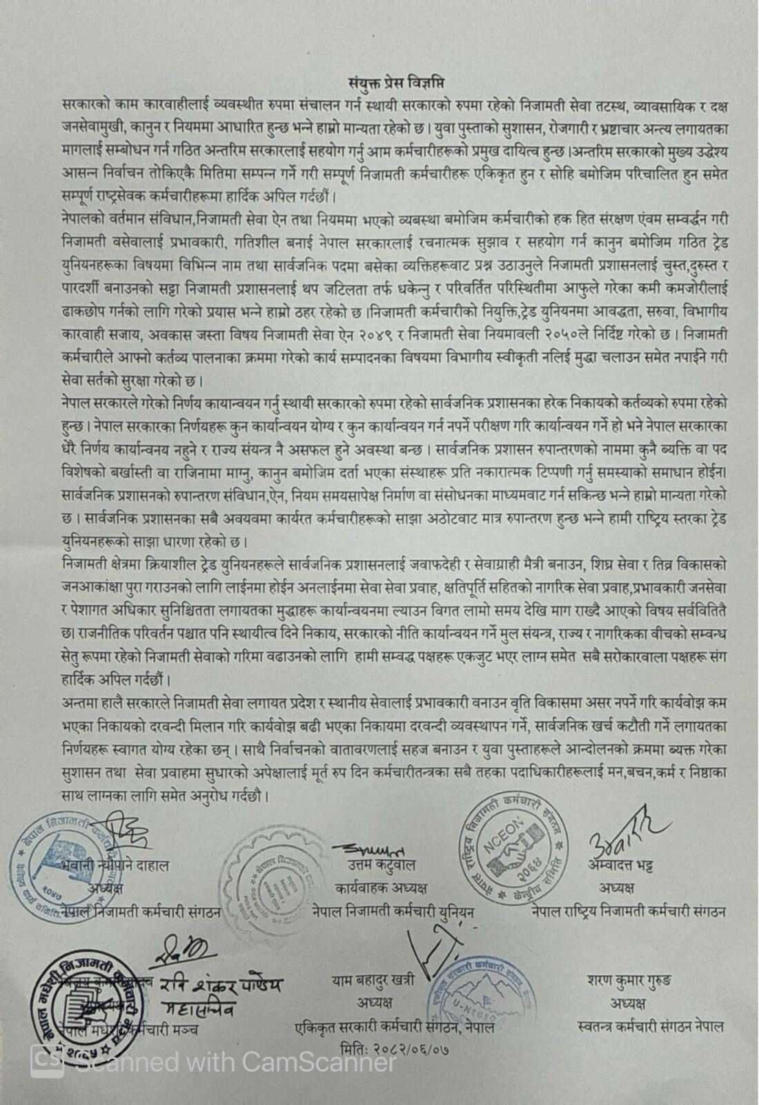 काठमाडौं । निजामती कर्मचारीको ट्रेड युनियनहरूले पछिल्लो समय सार्वजनिक प्रशासन रुपान्तरणको नाममा कुनै व्यक्ति वा पद विशेषको बर्खास्ती वा राजीनामा माग्ने, निजामती प्रशासनलाई बिथोल्न खोज्ने प्रवृति तत्काल रोक्न ध्यानाकर्षण गराएका छन् ।
