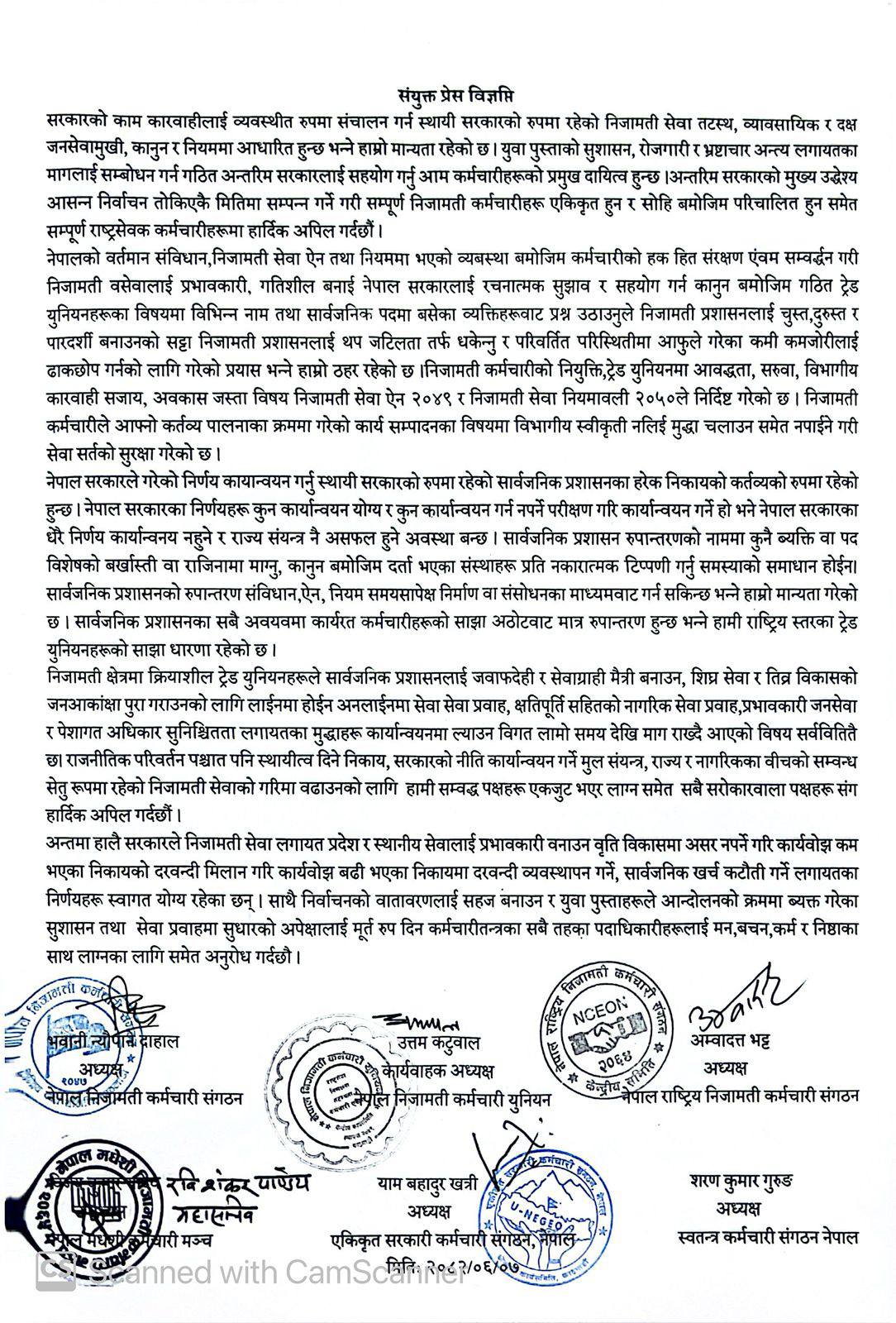 उनीहरूले भयरहित अवस्थामामा राष्ट्रसेवकले काम गर्न नसके निर्वाचनमा खट्ने मनोबल समेत नहुने भन्दै उनीहरुले सरकारले अभिभावकत्व देखाउनु पर्ने बताएका छन् । यसअघि उनीहरूले मुख्यसचिवलाई पनि भेटेर ज्ञापनपत्र बुझाएका थिए ।