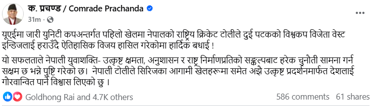 उनले लेखेका छन्,‘यूएईमा जारी युनिटी कपअन्तर्गत पहिलो खेलमा नेपालको राष्ट्रिय क्रिकेट टोलीले दुई पटकको विश्वकप विजेता वेस्ट इन्डिजलाई हराउँदै ऐतिहासिक विजय हासिल गरेकोमा हार्दिक बधाई । यो सफलताले नेपाली युवाशक्ति– उत्कृष्ट क्षमता, अनुशासन र राष्ट्र निर्माणप्रतिको सङ्कल्पबाट हरेक चुनौती सामना गर्न सक्षम छ भन्ने पुष्टि गरेको छ। नेपाली टोलीले सिरिजका आगामी खेलहरूमा समेत अझै उत्कृष्ट प्रदर्शनमार्फत देशलाई गौरवान्वित पार्ने विश्वास लिएको छु ।’