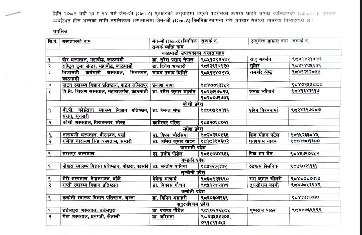 घाइतेहरुको फलोअप उपचार व्यवस्थित होस् भन्ने उद्देश्यले काठमाडौं उपत्यकासहित देशभरका १६ अस्पतालहरुमा जेनजी क्लिनिक स्थापना गरिएको हो । साथै जेनजी आन्दोलनका घाइतेहरुलाई अस्पतालसम्म निःशुल्क आउजाउको व्यवस्था समेत मिलाइएको मन्त्रालयले जनाएको छ । जेनजी आन्दोलनका घाइतेहरुको उपचारमा सहजताका लागि अस्पतालहरुमा फोकल व्यक्तिहरु पनि तोकिएको छ ।