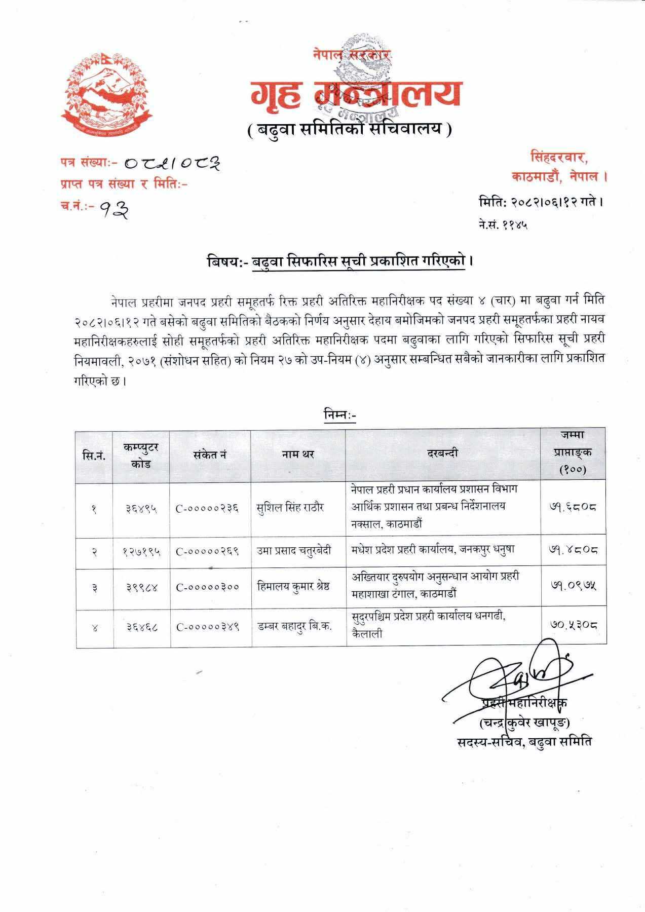 राठौरलाई नेपाल प्रहरी प्रधान कार्यालयको प्रशासन विभाग आर्थिक प्रशासन तथा प्रबन्ध निर्देशनालय नक्सालमा सिफारिस गरिएको छ। चतुरवेदीलाई मधेश प्रहरी कार्यालय, जनकपुरधाम, श्रेष्ठलाई अख्तियार दुरुपयोग अनुसन्धान आयोग प्रहरी महाशाखा टंगाल तथा विकलाई सुदूरपश्चिम प्रदेश प्रहरी कार्यालय धनगढी कैलालीमा दरबन्दी सिफारिस गरिएको छ ।