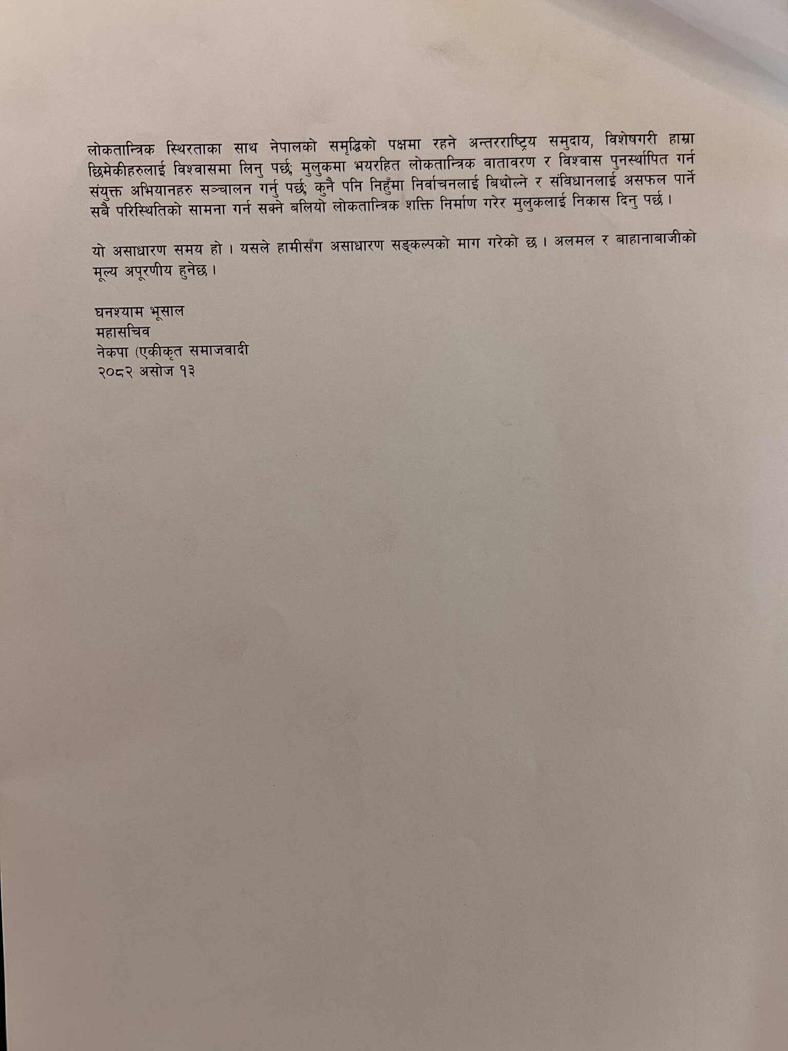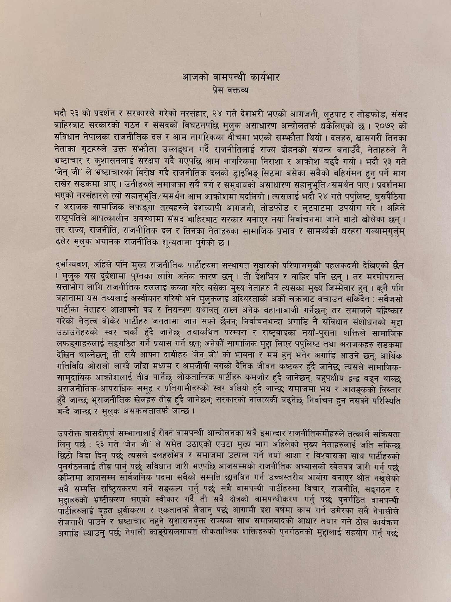 जेनजी आन्दोलनपछिको अवस्थाका बारेमा आज पत्रकार सम्मेलन आयोजना गर्दै नेता भुसालले मुलुकलाई नयाँ बिन्दुमा लैजाने यो महत्वपूर्ण अवसर भएको बताए । बाम एकता र कम्युनिष्ट मोर्चाको अभियान चलाइरहेका नेता भुसालले अहिले भएका पार्टीहरु बढीमा दुई महिनाभित्र सुध्रिएनन् भने राजनीतिक दल र देशमै ठूलो क्षति पुग्ने चेतावनी दिएका छन् ।