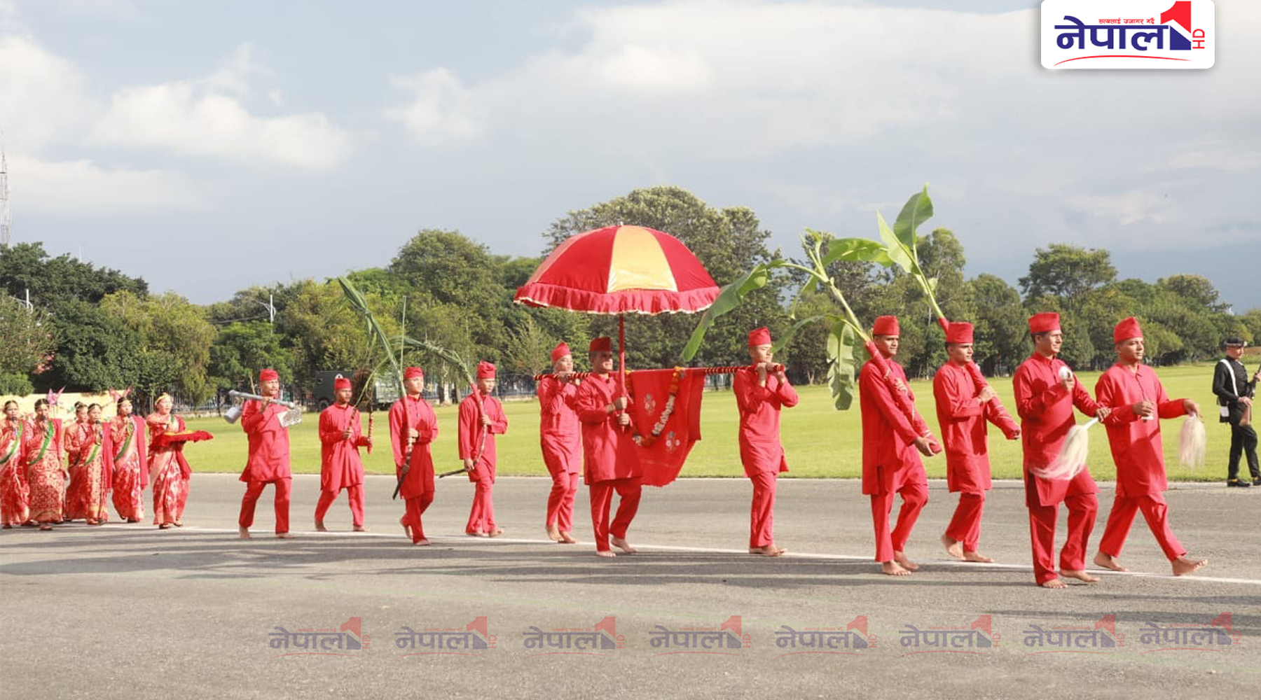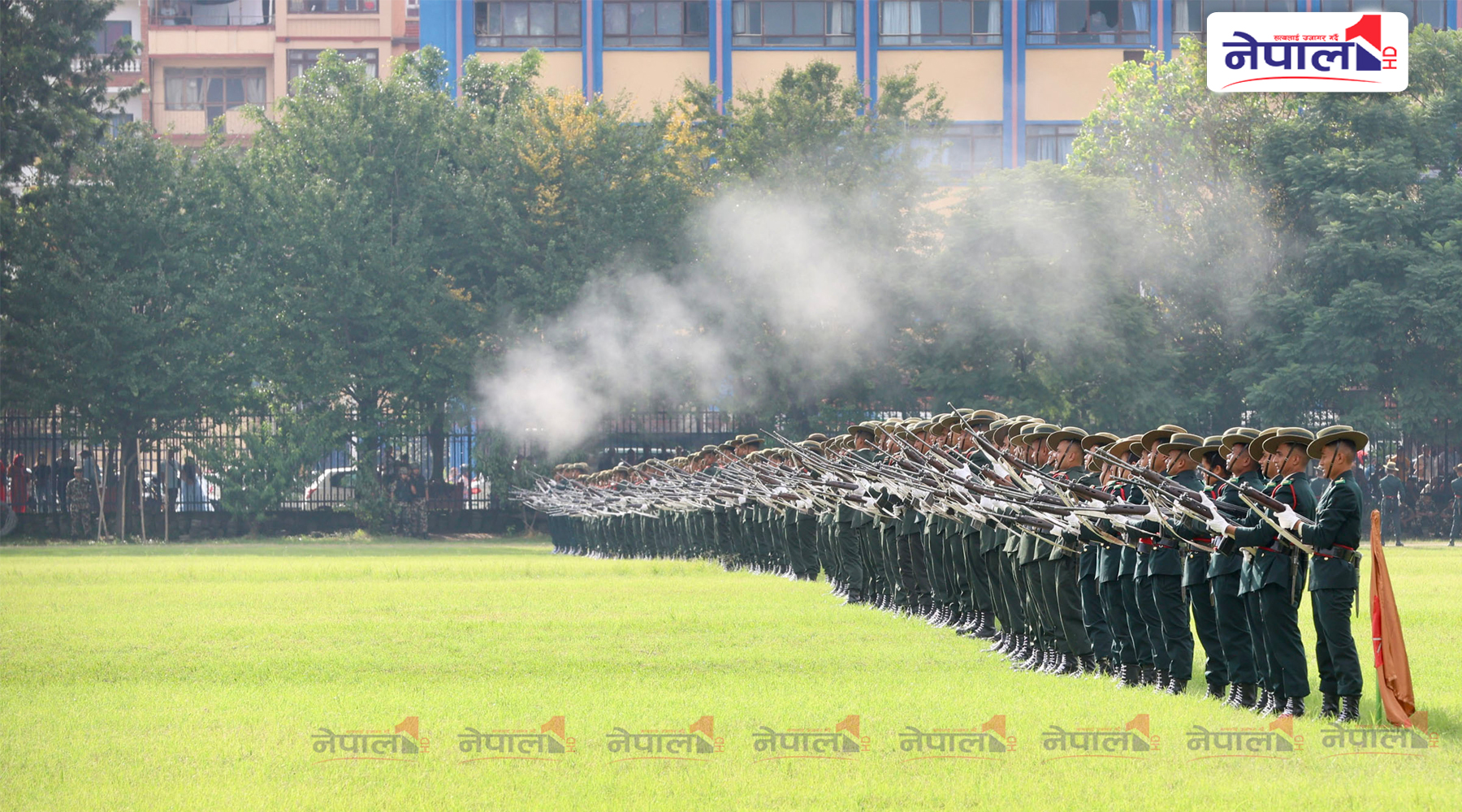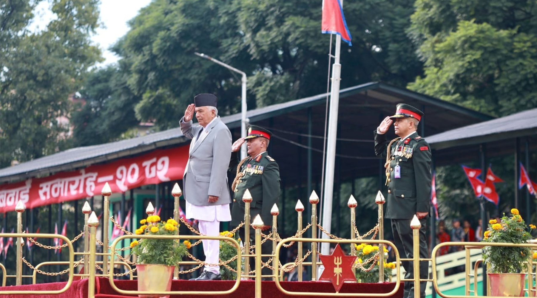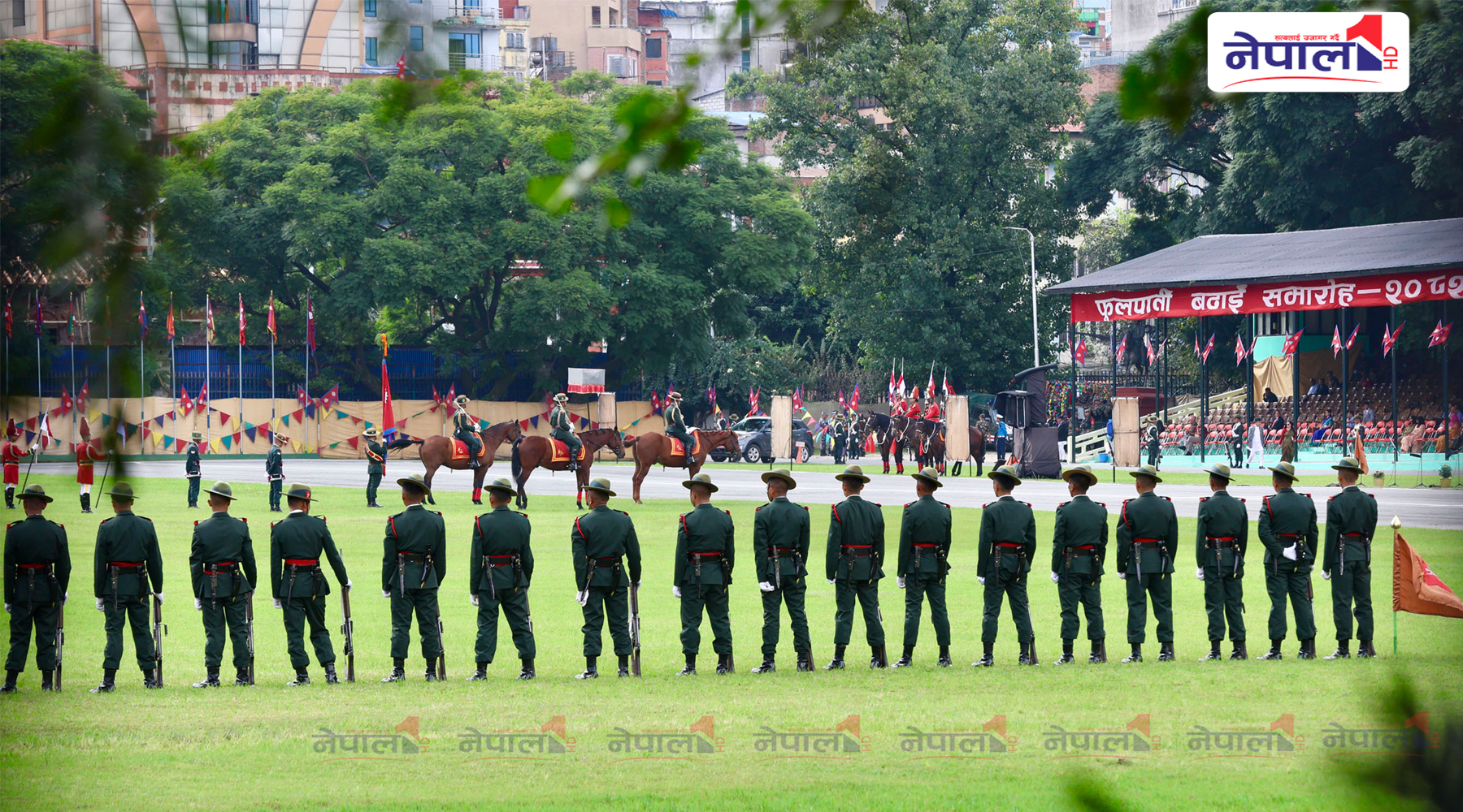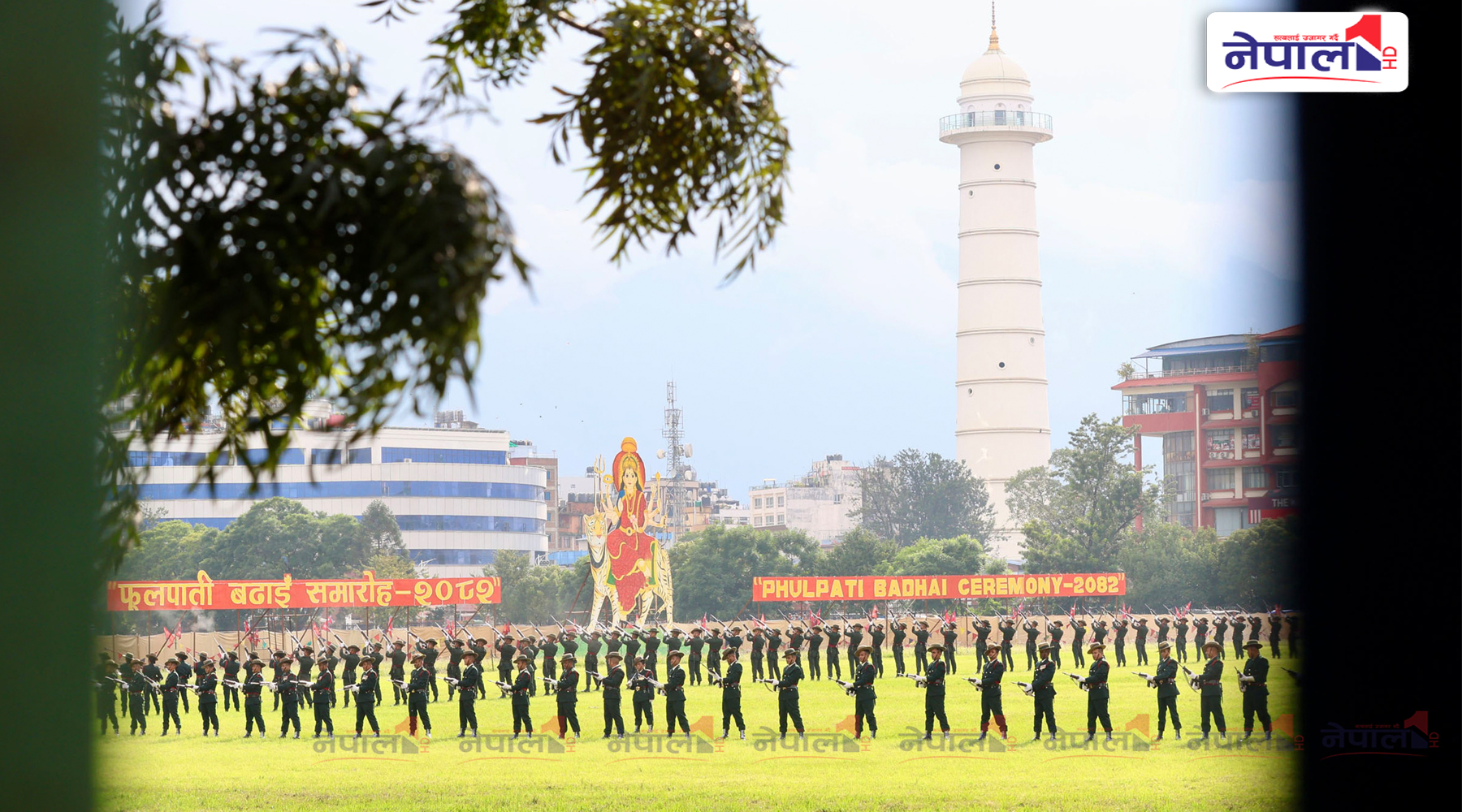 काठमाडौं । राष्ट्रपति रामचन्द्र पौडेलको प्रमुख आतिथ्यमा सैनिक मञ्च टुँडीखेलमा ‘फूलपाती बढाइँ समारोह’ सम्पन्न भएको छ । समारोहमा नेपाली सेनाका परमाधिपति राष्ट्रपति पौडेलको सम्मानमा नेपाली सेनाले सलामी अर्पण गरेको थियो । सो समारोहमा सेनाको टोलीले राइफलबाट लहरे र एकठ्ठा तथा तोपबाट पनि बढाइँ गरेको थियो ।