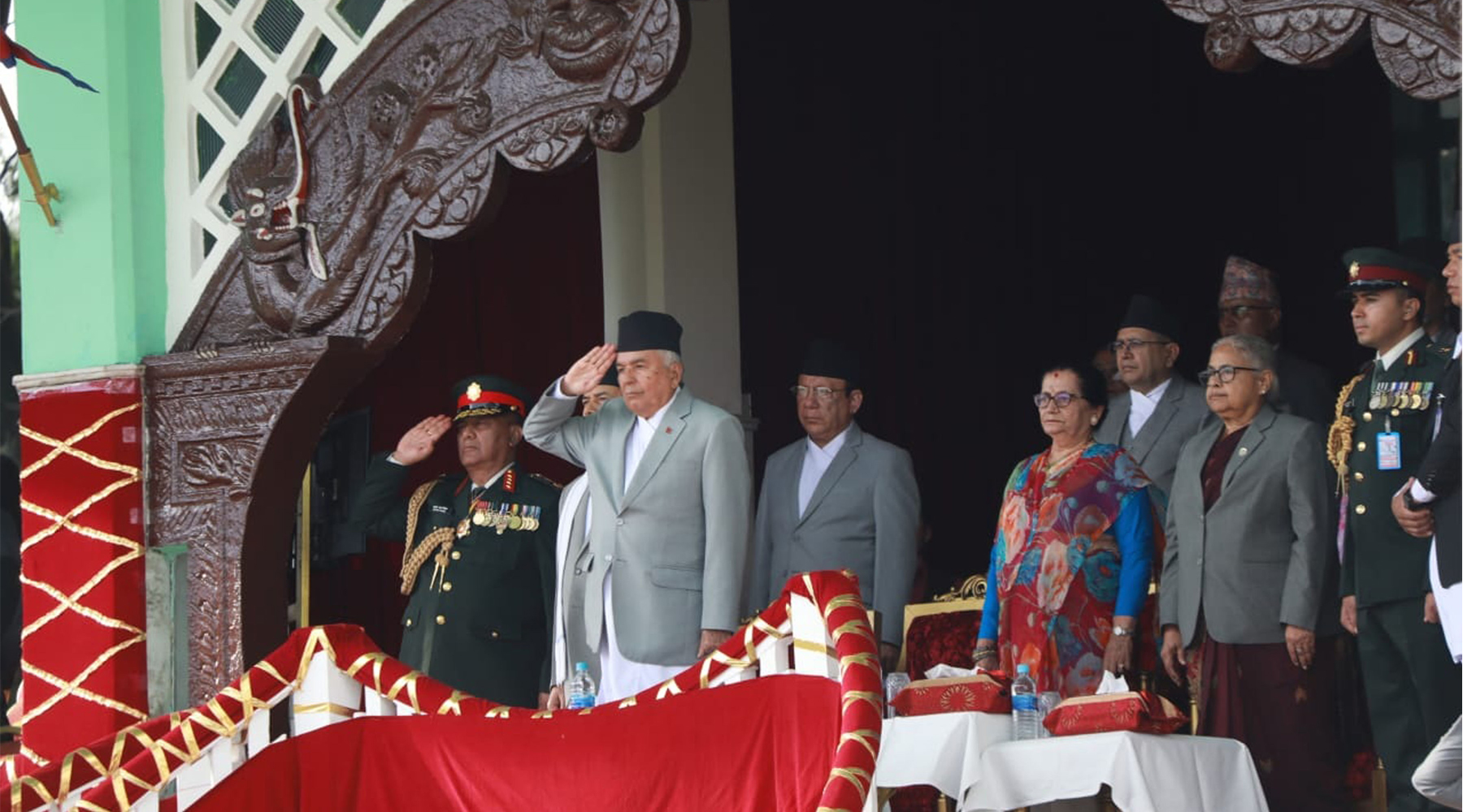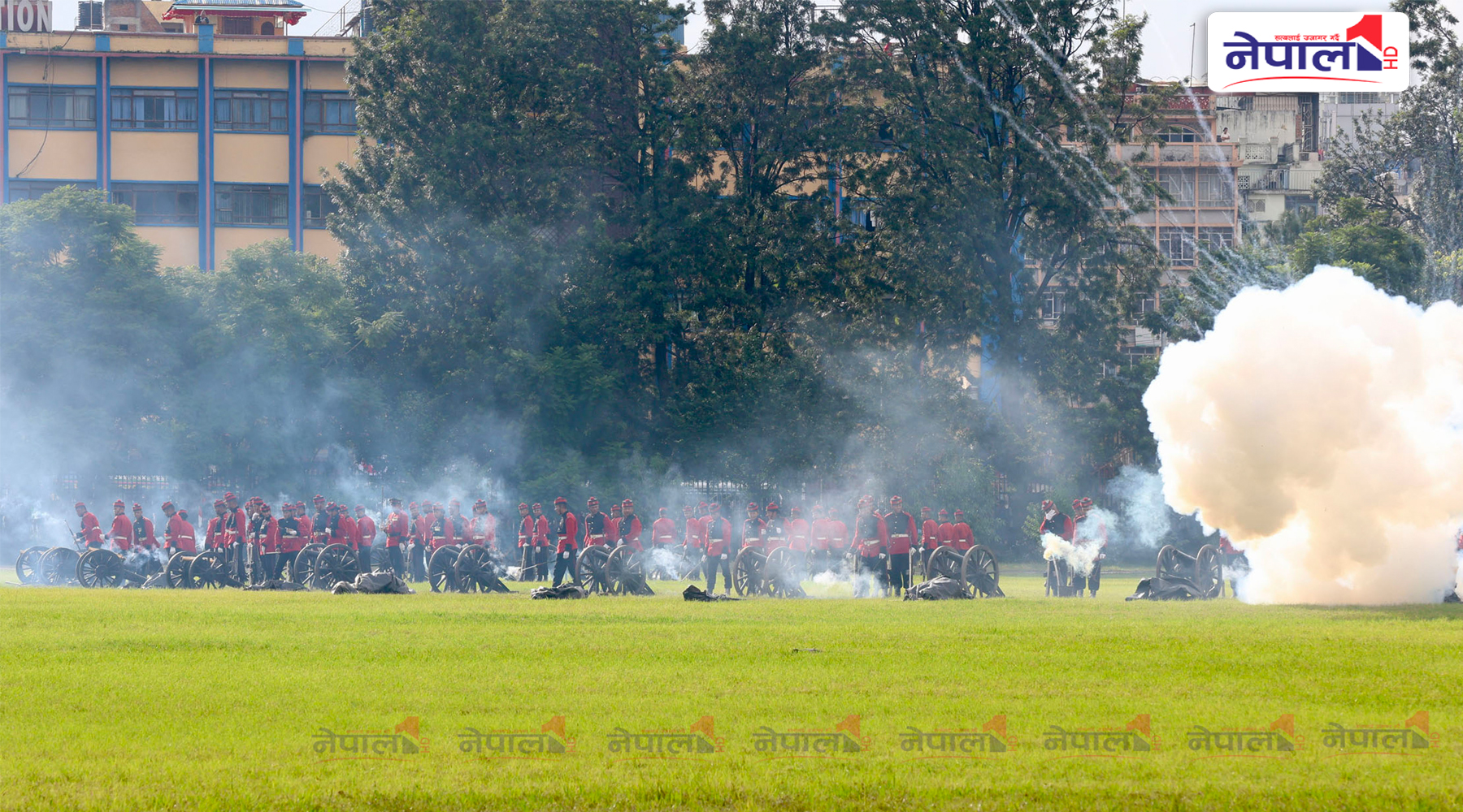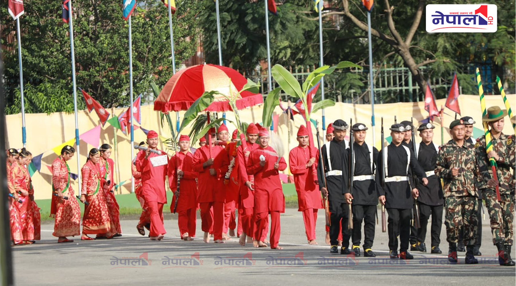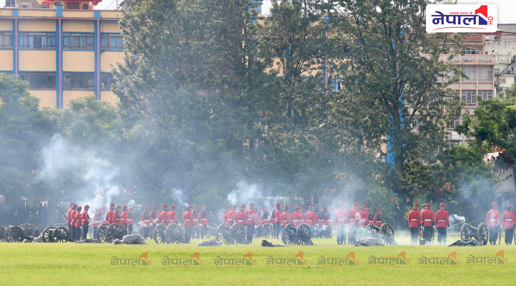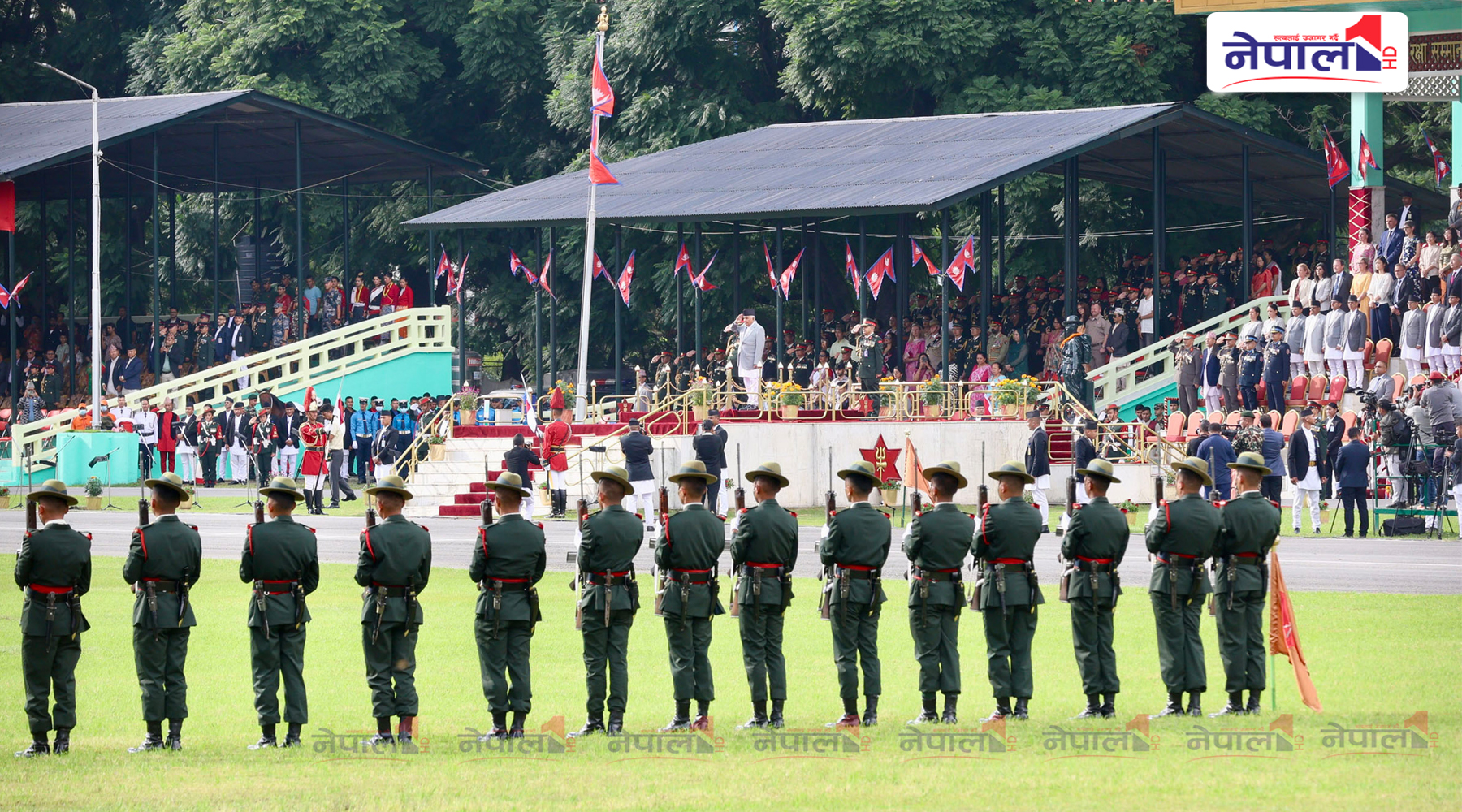 काठमाडौं । राष्ट्रपति रामचन्द्र पौडेलको प्रमुख आतिथ्यमा सैनिक मञ्च टुँडीखेलमा ‘फूलपाती बढाइँ समारोह’ सम्पन्न भएको छ । समारोहमा नेपाली सेनाका परमाधिपति राष्ट्रपति पौडेलको सम्मानमा नेपाली सेनाले सलामी अर्पण गरेको थियो । सो समारोहमा सेनाको टोलीले राइफलबाट लहरे र एकठ्ठा तथा तोपबाट पनि बढाइँ गरेको थियो ।