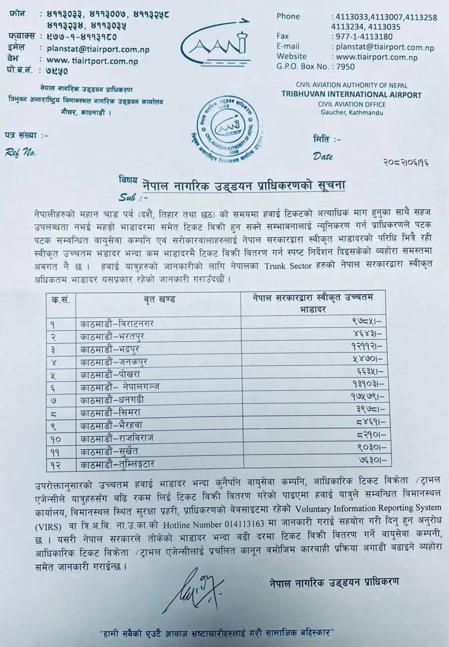 काठमाडौं । चाडबाडका बेला हवाई टिकटको माग अत्यधिक हुँदा महँगोमा बिक्री गर्न सक्ने सम्भावनालाई ध्यान दिँदै नेपाल नागरिक उड्डयन प्राधिकरणले आन्तरिक उडानको हवाई भाडादर सार्वजनिक गरेको छ ।