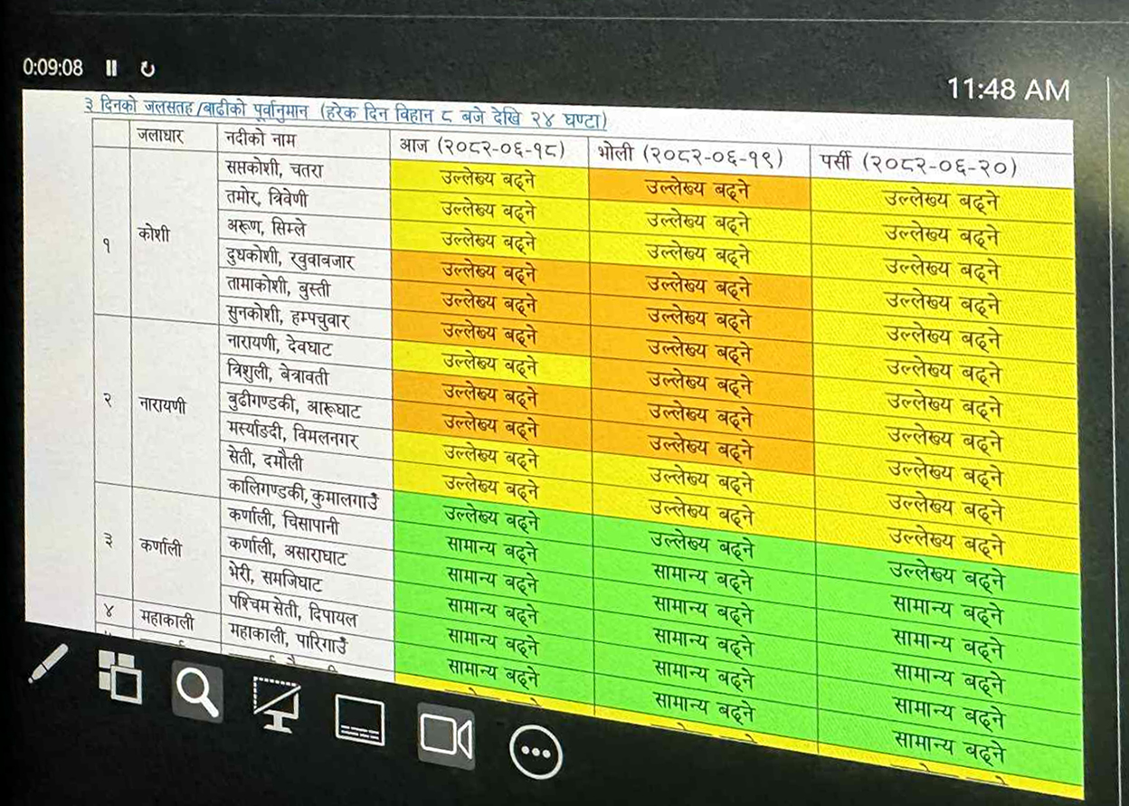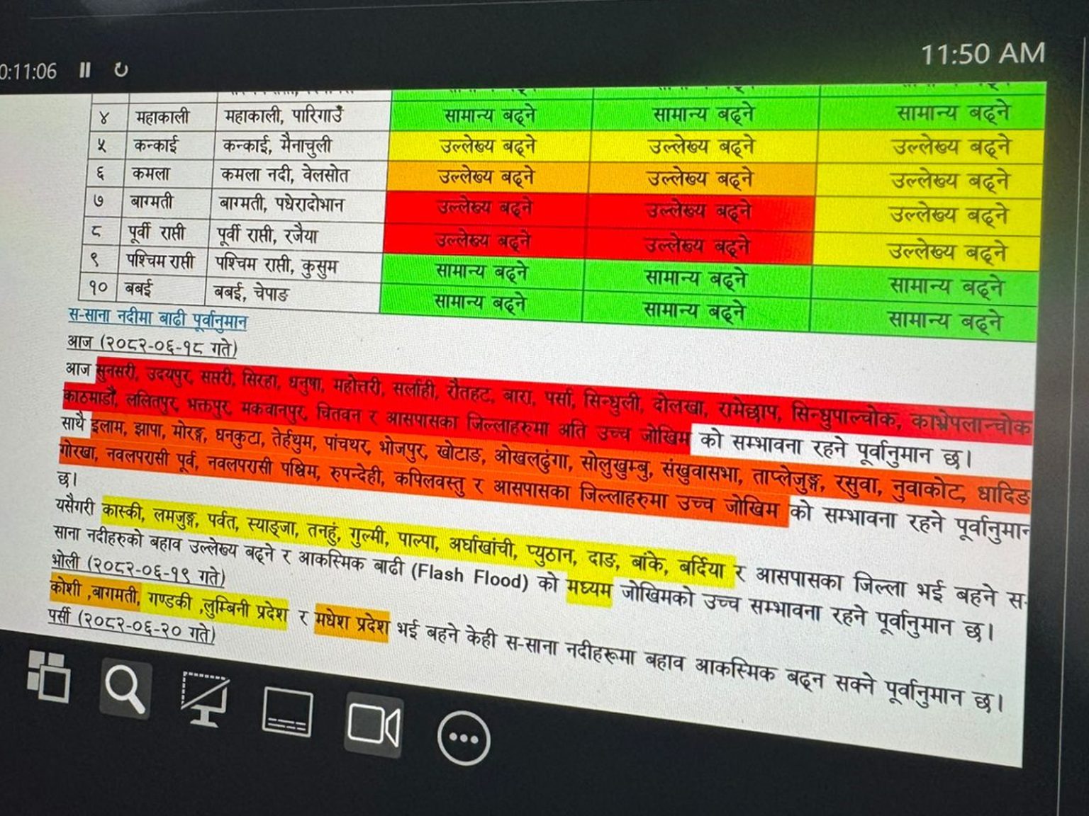 ‘अहिलेसम्म वर्षाले खतराको तह पार गरिसकेको त छैन तर त्यसको नजिक छ,’ पराजुलीले भने । विभागका अनुसार सुनसरी, उदयपुर, सप्तरी, सिरहा, धनुषा, महोत्तरी, सर्लाही, रौतहट, बारा, पर्सा, सिन्धुली, दोलखा, रामेछाप, सिन्धुपाल्चोक, काभ्रे लगायतका जिल्लामा बाढीको अति उच्च जोखिम छ ।