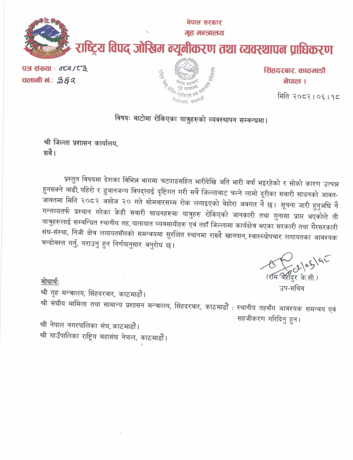 देशभरको अविरल भारी बर्षाका कारण लामो दूरीका सवारी साधन आवागमन रोकिएको अवस्थामा बाटोमै रोकिएका यात्रुको व्यवस्थापन र भोजनको व्यवस्था मिलाउन आग्रह गरिएको हो ।