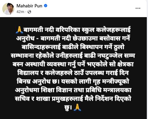 उनले सामाजिक सञ्जाल मार्फत अनुरोध गर्दै भनेका छन् , ‘बागमती नदी वरिपरिका स्कुल कलेजहरूलाई अनुरोध– बागमती नदी छेउछाउमा बसोवास गर्ने बासिन्दाहरूलाई बाढीले विस्थापन गर्ने ठूलो सम्भावना रहेकोले उनीहरूलाई बाढी नघटुञ्जेल सम्म बस्न अस्थायी व्यवस्था गर्नु पर्ने भएकोले सो क्षेत्रका विद्यालय र कलेजहरूले ठाउँ उपलब्ध गराई दिन बिनम्र अनुरोध छ,’ उनले भने, ‘यसको लागी गृह मन्त्रीज्यूको अनुरोधमा शिक्षा विज्ञान तथा प्रविधि मन्त्रालयका सचिव र शाखा प्रमुखहरूलाई मैले निर्देशन दिएको छु ।’