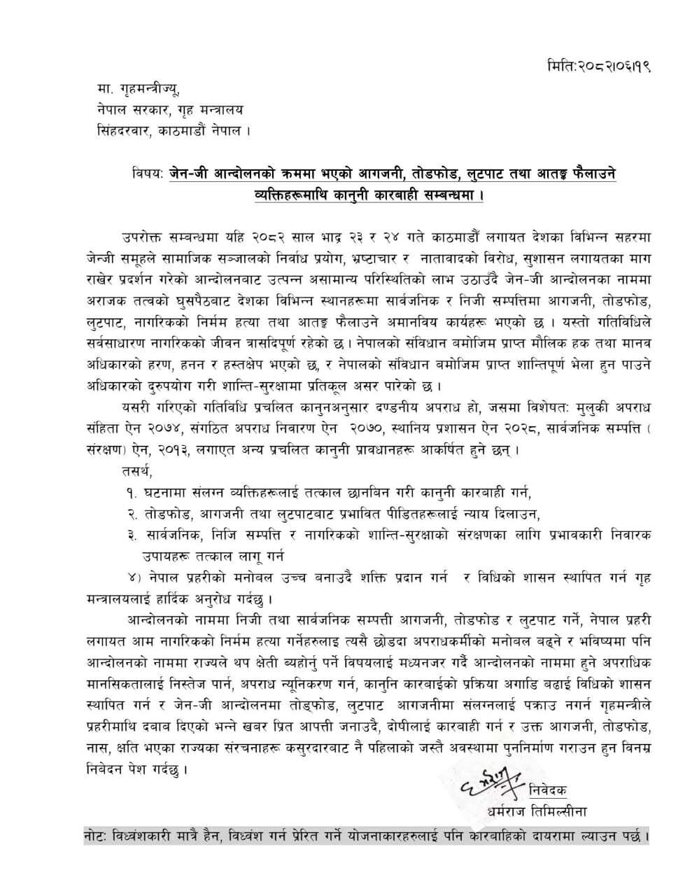 गृहमन्त्री समक्ष दिइएको निवेदनमा जेनजी आन्दोलनका नाममा अराजक तत्वको घुसपैठबाट देशका विभिन्न स्थानहरूमा सार्वजनिक र निजी सम्पत्तिमा आगजनी, तोडफोड, लुटपाट, नागरिकको निर्मम हत्या तथा आतंक फैलाउने अमानवीय कार्य भएको उल्लेख छ ।