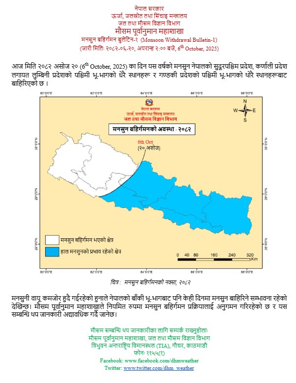 ‘आज मिति २०८२ असोज २० का दिन यस वर्षको मनसुन नेपालको सुदूरपश्चिम प्रदेश, कर्णाली प्रदेशलगायत लुम्बिनी प्रदेशको पश्चिमी भू–भागको धेरै स्थानहरू र गण्डकी प्रदेशको पश्चिमी भू–भागको थोरै स्थानहरूबाट बाहिरिएको छ’, महाशाखाले सोमबार दिउँसो जारी गरेको मनसुन बहिर्गमन बुलेटिनमा उल्लेख छ ।