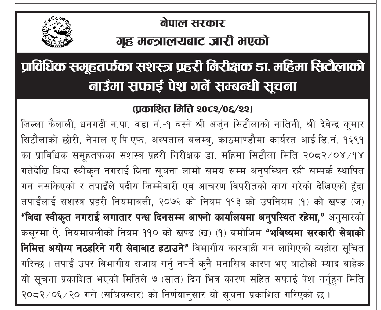 ‘बिदा स्वीकृत नगराई बिना सूचना लामो समयसम्म अनुपस्थित रही सम्पर्क स्थापित गर्न नसकिएको र तपाईले पदीय जिम्मेवारी एवं आचरण विपरीतको कार्य गरेको देखिएको हुँदा तपाईलाई सशस्त्र प्रहरीको नियमावली अनुसारको कसुरमा विभागीय कारबाही गर्न लागिएको व्यहोरा सूचित गरिन्छ,’ सूचनामा भनिएको छ, ‘तपाईँउपर विभागीय सजाय गर्नु नपर्ने कुनै मनासिव कारण भए बाटोको म्याद बाहेक यो सूचना प्रकाशित भएको मितिले सात दिनभित्र कारणसहित सफाई पेश गर्नु हुन यो सूचना प्रकाशित गरिएको छ ।’