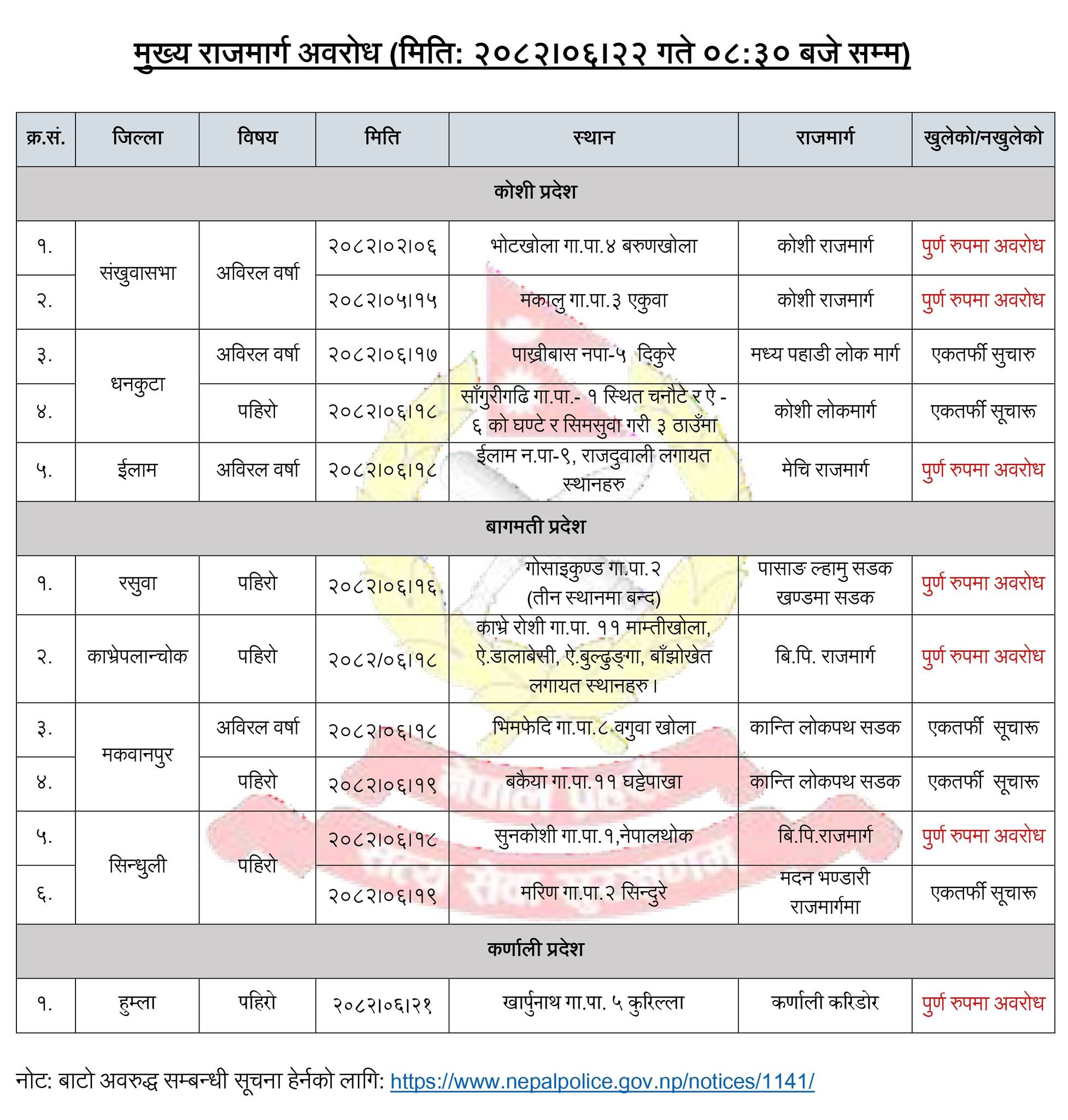 संखुवासभाको भोटखोला र मकालुमा कोशी राजमार्ग, इलामको इलाम नगरपालिका–९ मा मेची राजमार्ग, रसुवाको गोसाइँकुण्डमा पासाङ ल्यामु सडक, काभ्रेको रोसी गाउँपालिका–११ स्थित माम्तीखोला, सोही वडाको डालाबेसी, बुल्ढुंगा र बाँझोखेतमा सडक अवरुद्ध छ ।