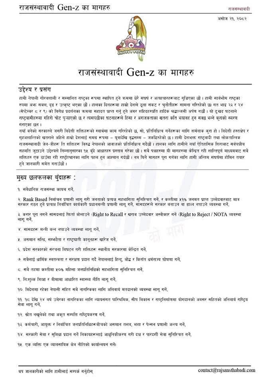 काठमाडौं । जेनजीका नाममा विभिन्न समूह देखापरिरहेका बेला अर्को एउटा समूह देखिएको छ– ‘राजसंस्थावादी जेनजी’ । जसले विज्ञप्ति जारी गरी संवैधानिक राजसंस्थासहित १५ बुँदे माग प्रस्तुत गरेको छ र पूरा नभए ‘अन्तिम संघर्षमा होमिने’ चेतावनी दिएको छ । तर विज्ञप्तिमा व्यक्ति कसैको नाम छैन । थप जानकारीका लागि सम्पर्क भन्दै @rajsansthabadi.com लेखिएको छ ।
