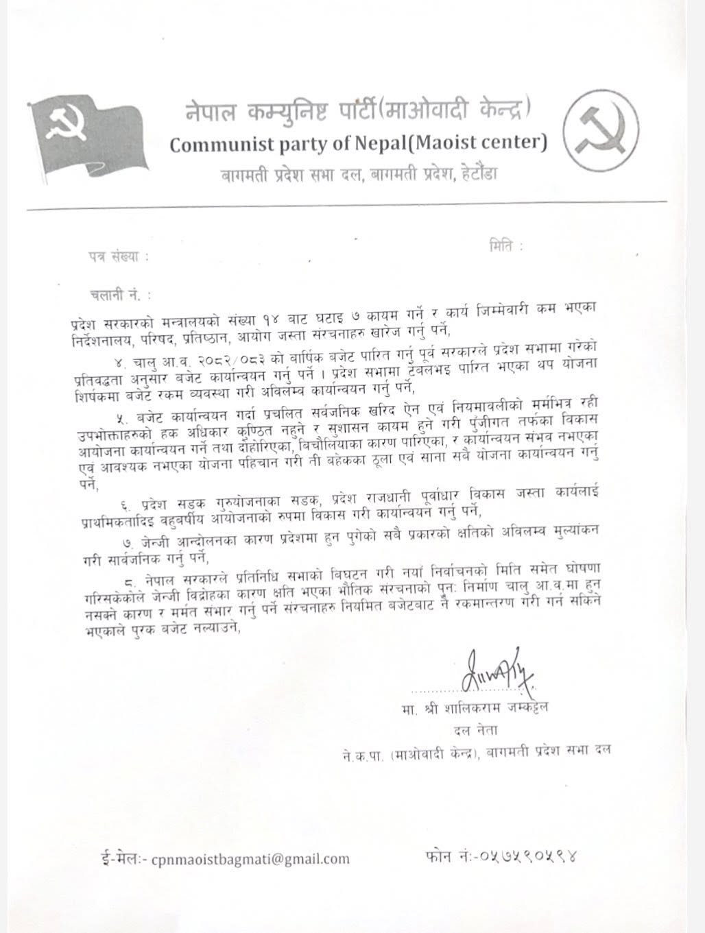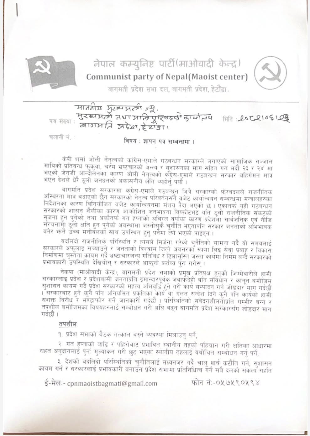 बागमतीका मुख्यमन्त्रीलाई माओवादीको ज्ञापनपत्र : मन्त्रालय आधा घटाऊ, संसद वैठक तत्काल बोलाऊ