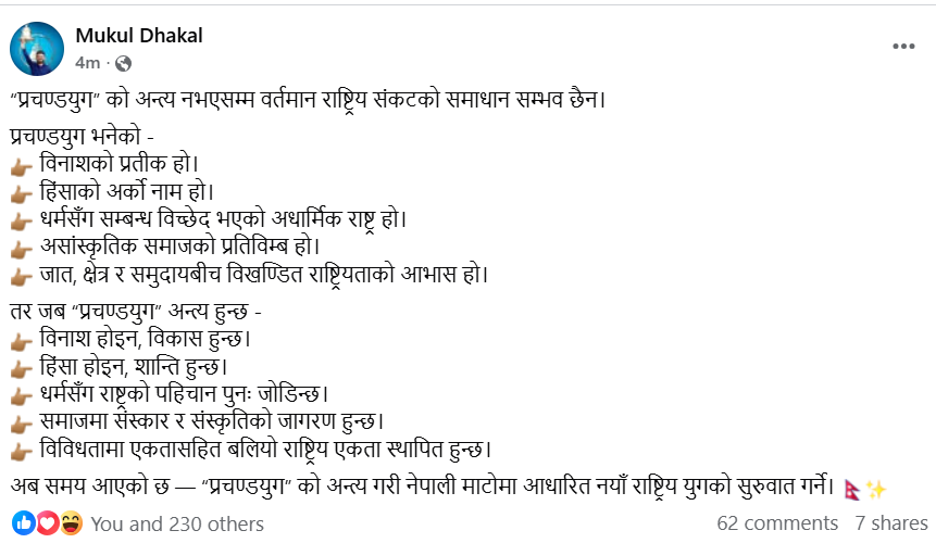 काठमाडौं । राष्ट्रिय स्वतन्त्र पार्टीका पूर्व महामन्त्री डा. मुकुल ढकालले ‘प्रचण्ड युग’ अन्त्य नभएसम्म यो देशमा शान्ति, विकास र एकता नहुने टिप्पणी गरेका छन् । सामाजिक सञ्जालमा लेख्दै उनले प्रचण्ड युग भनेको विनाश, हिंसा, अधर्म र विखण्डित राष्ट्रियताको प्रतिक हो भन्दै यो अन्त्य नभएसम्म राष्ट्रिय संकट समाधान नहुने बताएका हुन् ।