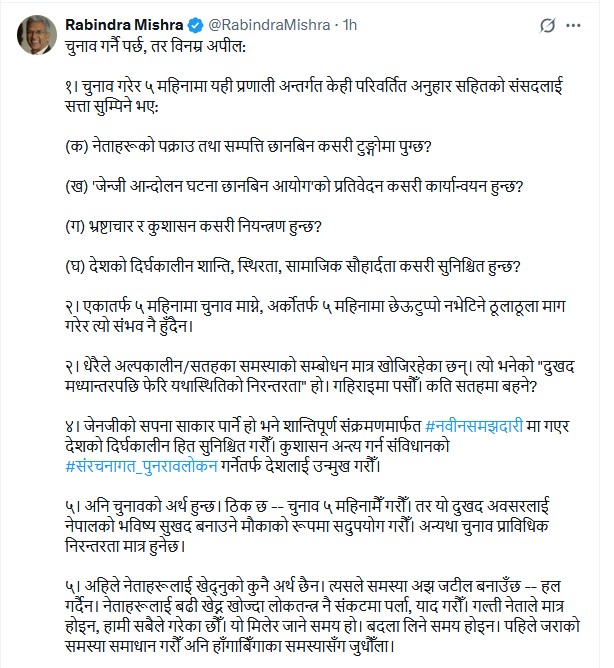 चुनावप्रति मिश्रको समर्थन स्पष्ट छ—तर शर्तसहित । ‘ठिक छ, चुनाव ५ महिनामै गरौ’ं, उनी भन्छन्, ‘तर यो चुनाव दुःखद घटनाको निरन्तरता होइन, नेपालको भविष्य सुखद बनाउने मोका बनोस् ।’ उनका अनुसार, चुनाव आफैंमा समाधान होइन—यदि गहिरो संरचनागत समस्या ज्यूँका त्यूँ रहे, तिनै पुराना अनुहार फर्केर आउने छन् र मुलुक फेरि सोही चक्रमा फस्नेछ । मिश्रले सतही समाधानको मोह त्यागेर गहिरो, दूरदर्शी र संरचनागत परिवर्तनतर्फ उन्मुख हुन सबै राजनीतिक शक्तिहरूलाई आग्रह गरेका छन् ।