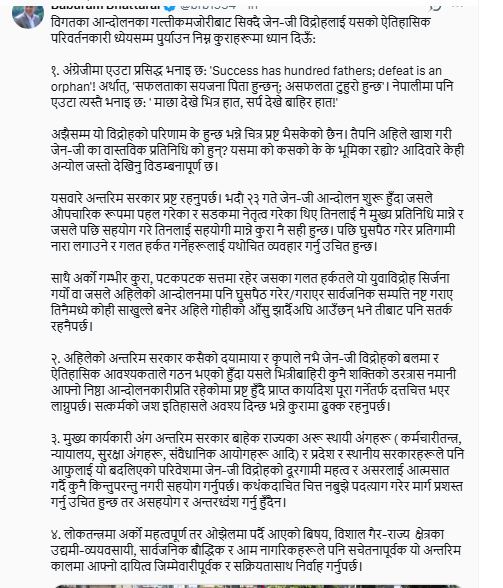सामाजिक सञ्जाल ट्वीटर (एक्स) मा धारणा राख्दै उनले चेतावनी दिएका छन् कि विगतमा बारम्बार सत्तामा रही जनविरोधी काम गरेका र अहिलेको विद्रोहकै कारण जन्मिएको सरकारलाई पनि भित्रैदेखि कमजोर बनाउने प्रयासमा लाग्नेहरू अहिले साखुल्लेका रूपमा अगाडि नआउन् । ‘अझ खतरनाक त के भने, तीमध्ये कतिपय अहिले गोहीको आँशु झार्दै नेतृत्वमा देखिन थालेका छन्’, उनले भनेका छन् ।