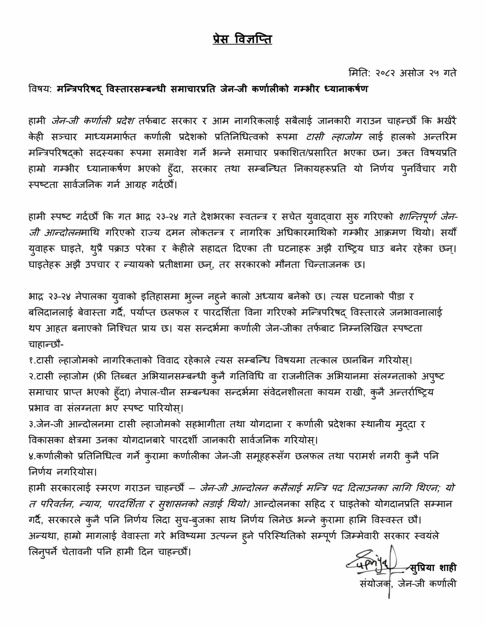 जेन–जीहरूले प्रधानमन्त्रीलाई टासीको नाममा पुनः विचार गर्न, प्रदेश प्रतिनिधित्वको विषयमा कर्णालीका युवाहरूसँग औपचारिक परामर्श गर्न र कुनै विवादास्पद नाम अगाडि नबढाउन आग्रह गरेका छन् ।