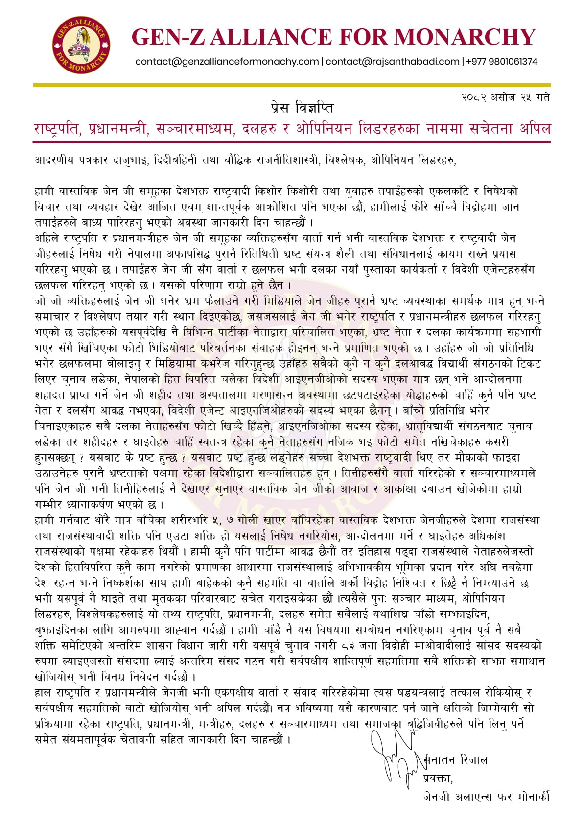 जेन जेड अलाइन्स फर मोनार्कीका प्रवक्ता सनातन रिजालले शनिबार जारी गरेको सार्वजनिक अपिलमा आन्दोलन ‘हाईज्याक’ गर्ने र आन्दोलनको मर्म विकृत गर्ने विदेशी वा डमी पात्रहरूलाई महत्व नदिन आग्रह गरिएको छ । अपिलमा भनिएको छ कि वास्तविक आन्दोलनकर्ता– देशभक्त राष्ट्रवादी किशोर–किशोरी र युवाहरूलाई निषेध गर्ने रवैया जारी राखिए राष्ट्रमा फेरि ठूलो विद्रोहको अवस्था सिर्जना हुन सक्ने चेतावनी दिइएको छ ।
