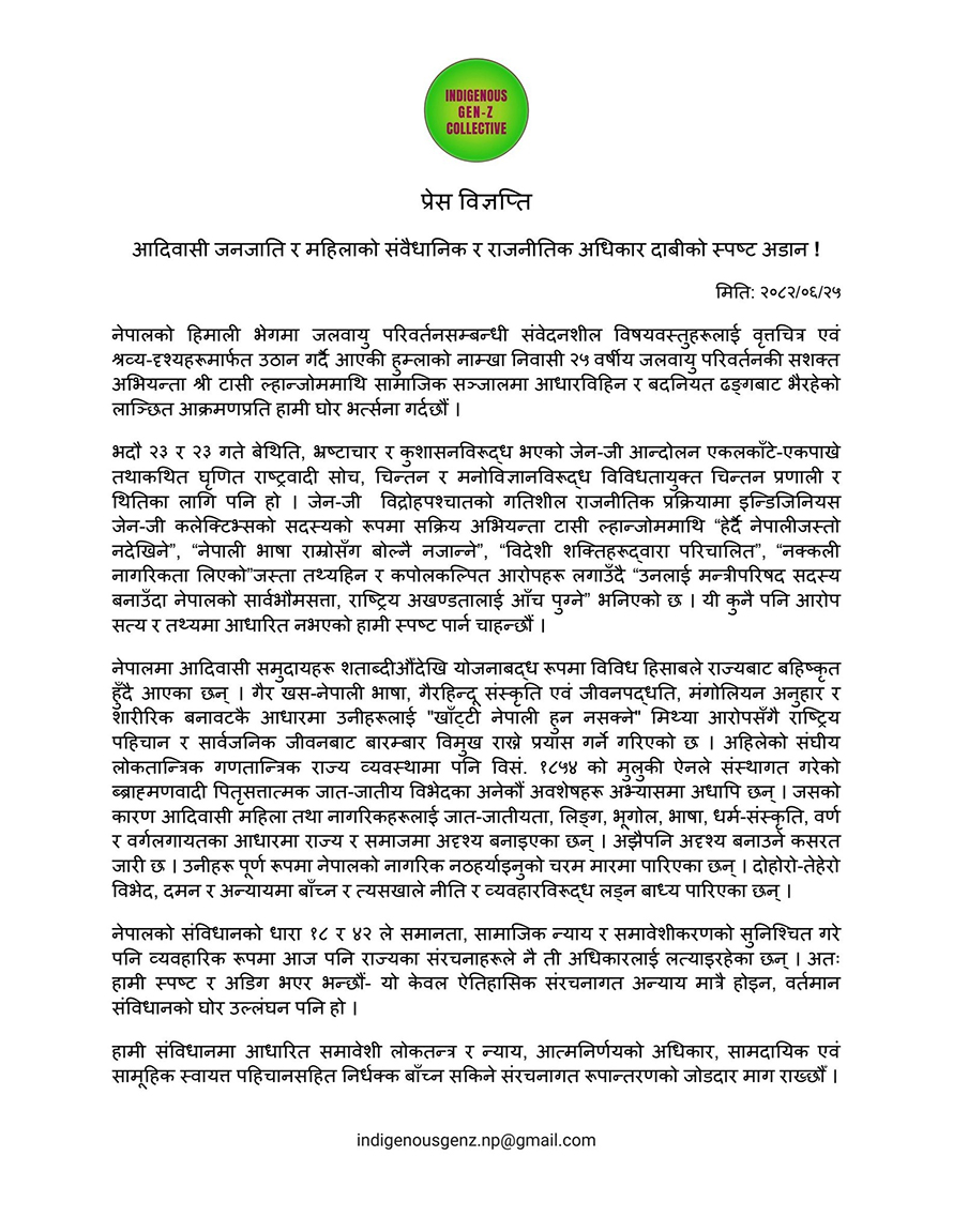 आदिवासी जेनजी कलेक्टिभको चेतावनी : टासीमाथिको दुर्व्यवहार स्वीकार्य छैन